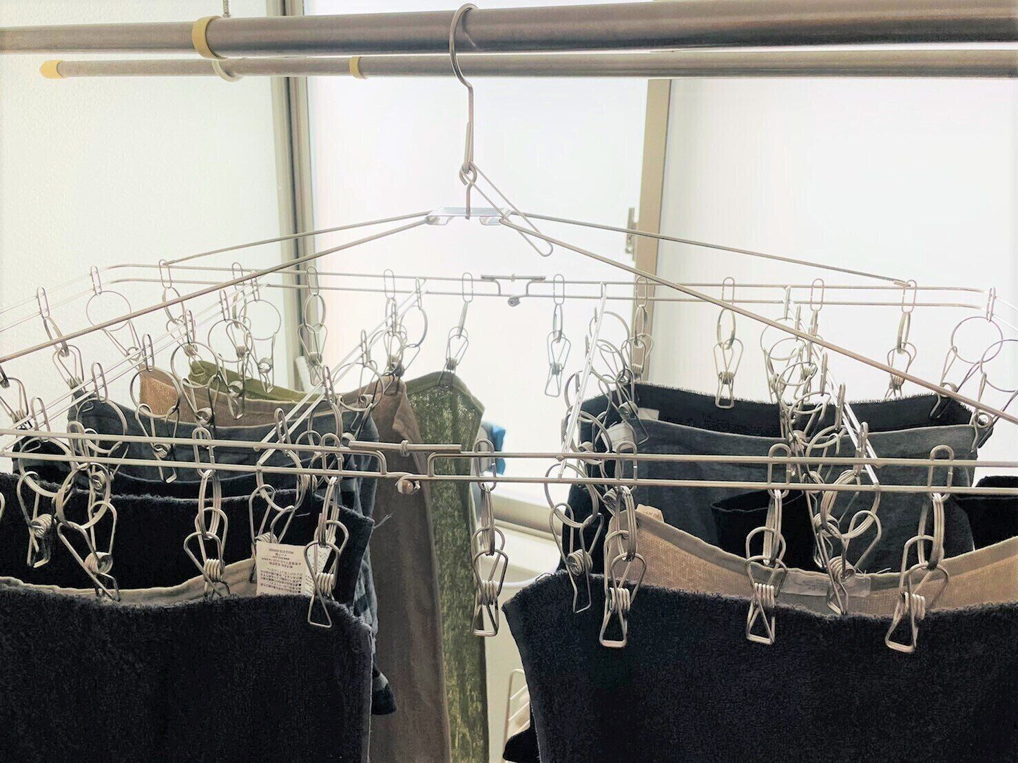我が家はハンガーだけではなく、ピンチハンガーも使って洗濯物を干していますが、アーチ型に干すことが洗濯物を早く乾かすコツです。