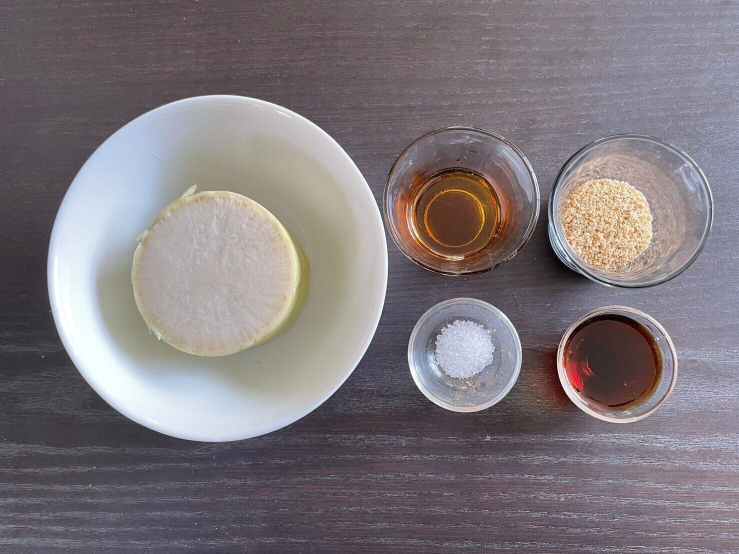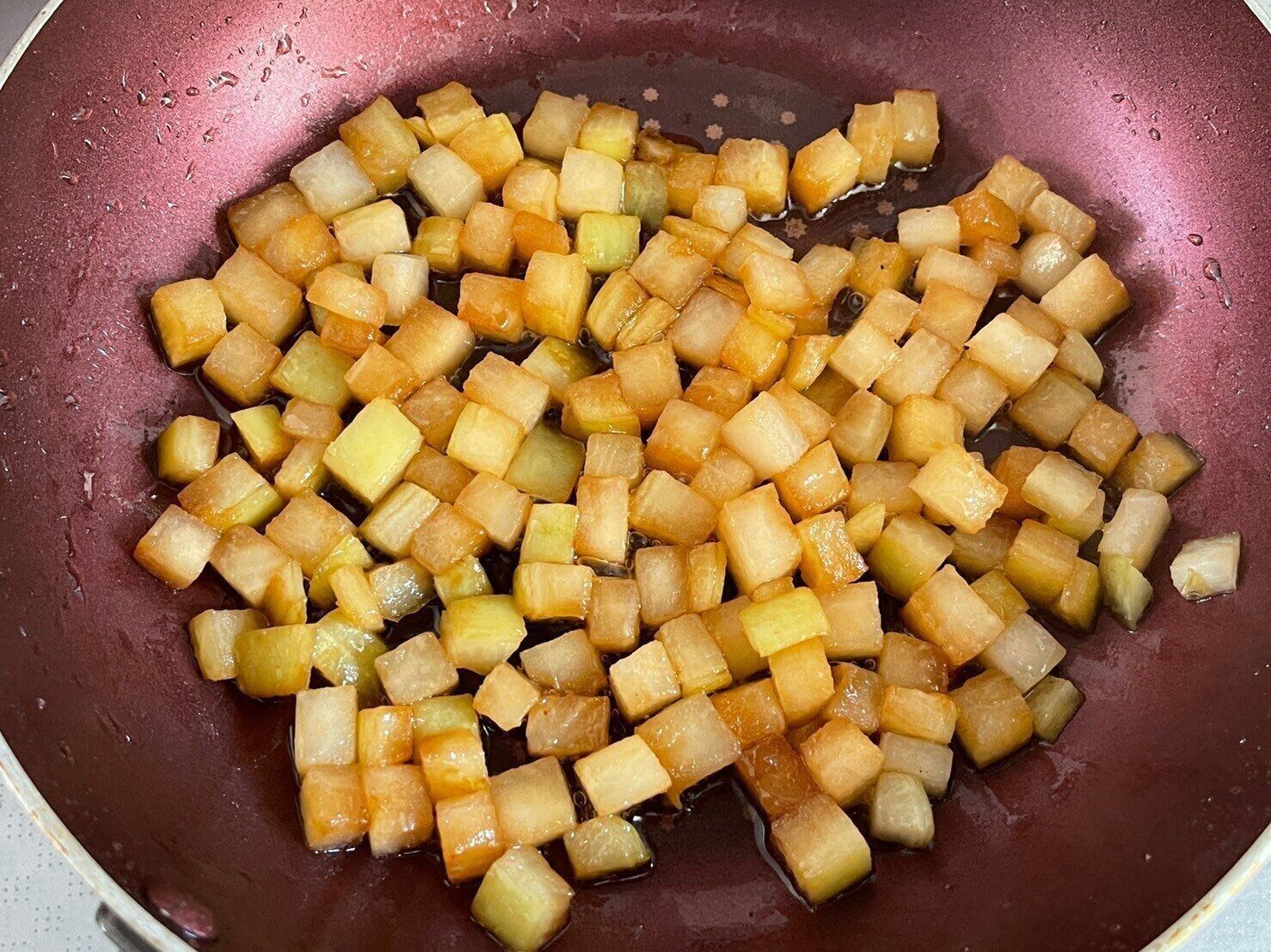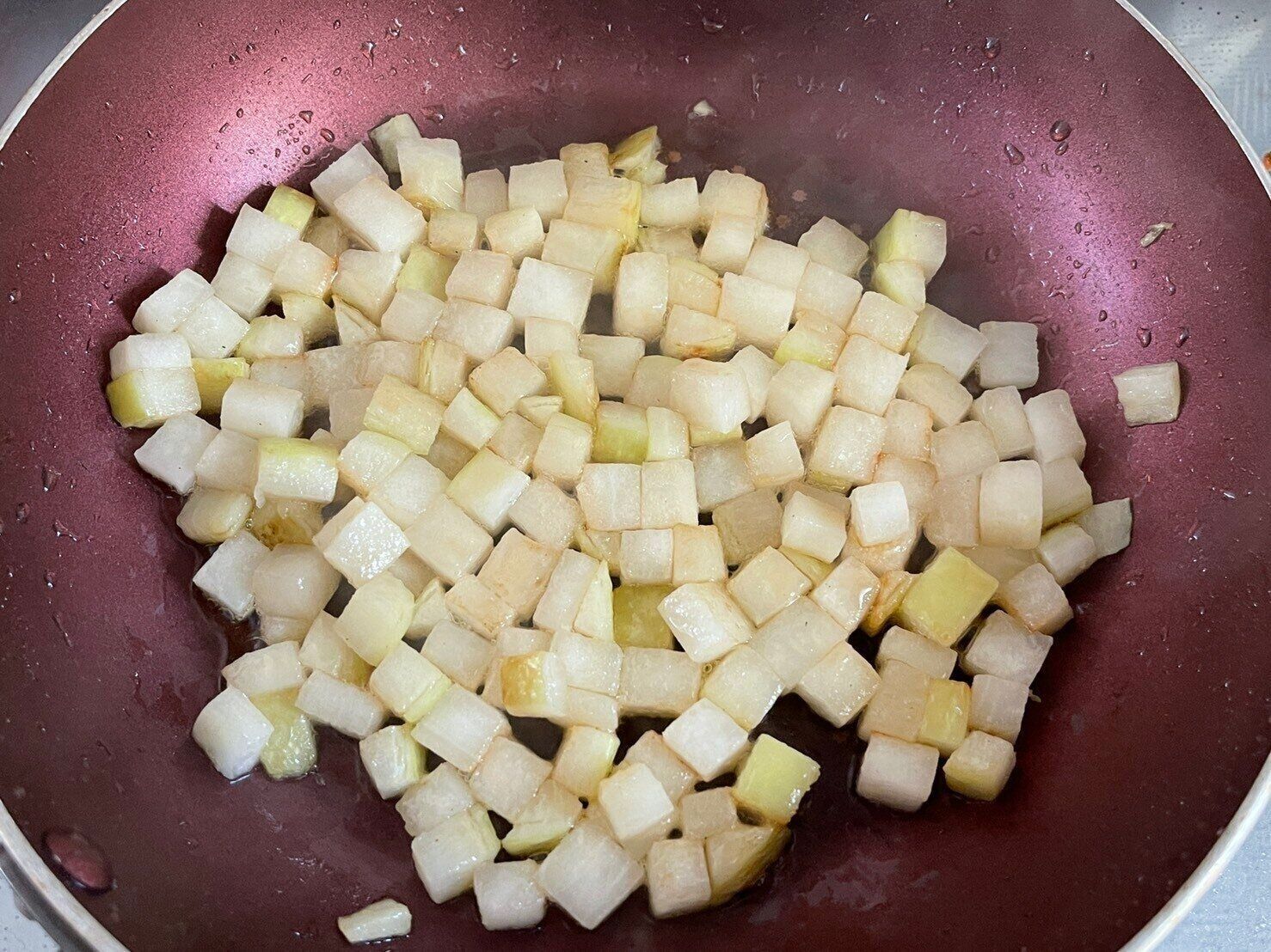 (1)大根を1cm角に切り、ごま油をひいたフライパンに塩とともに入れ、うっすら焼き色がつくまで加熱する。