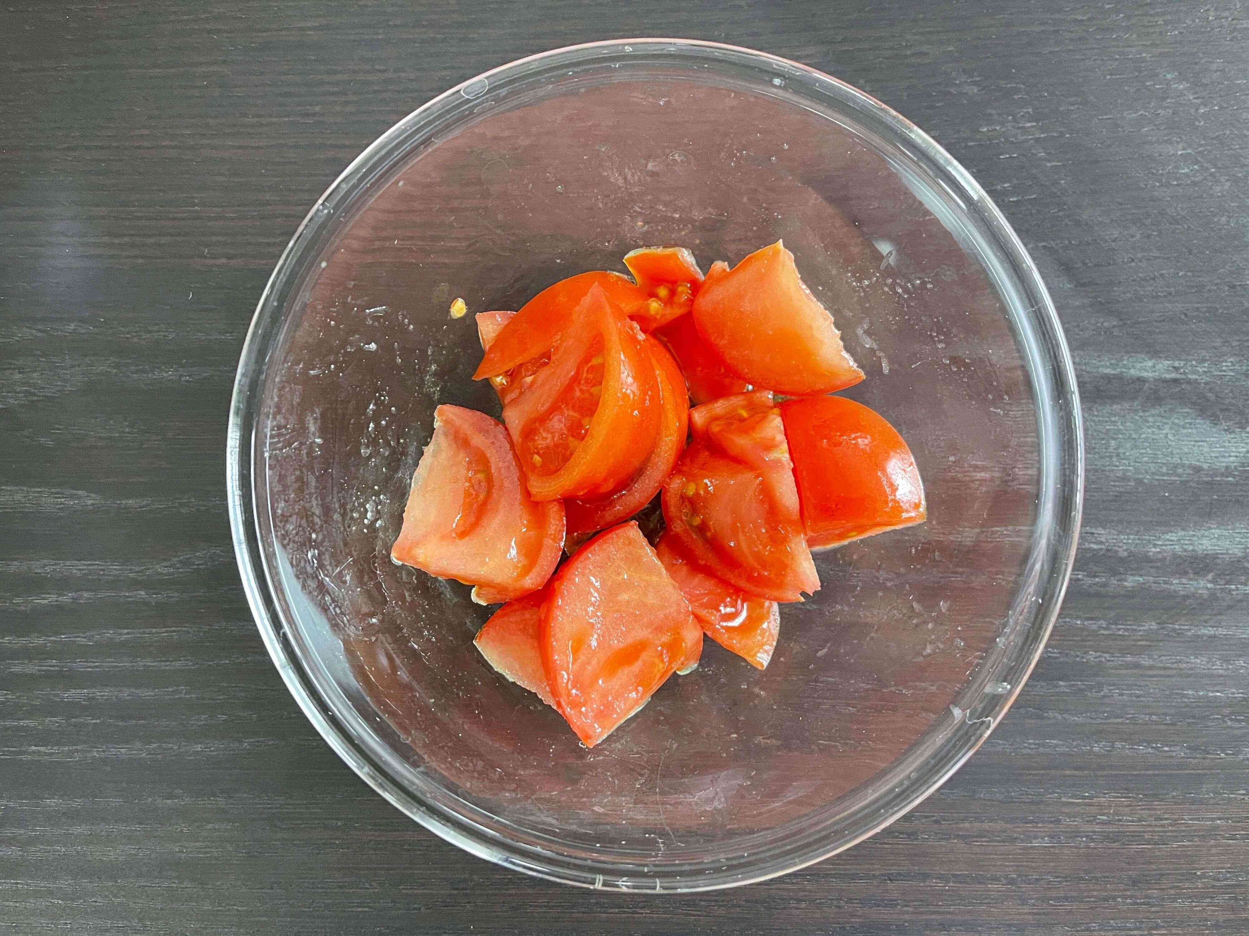 (1)トマトをくし切りにし、ごま油・めんつゆ・塩と合わせて冷蔵庫でよく冷やす。