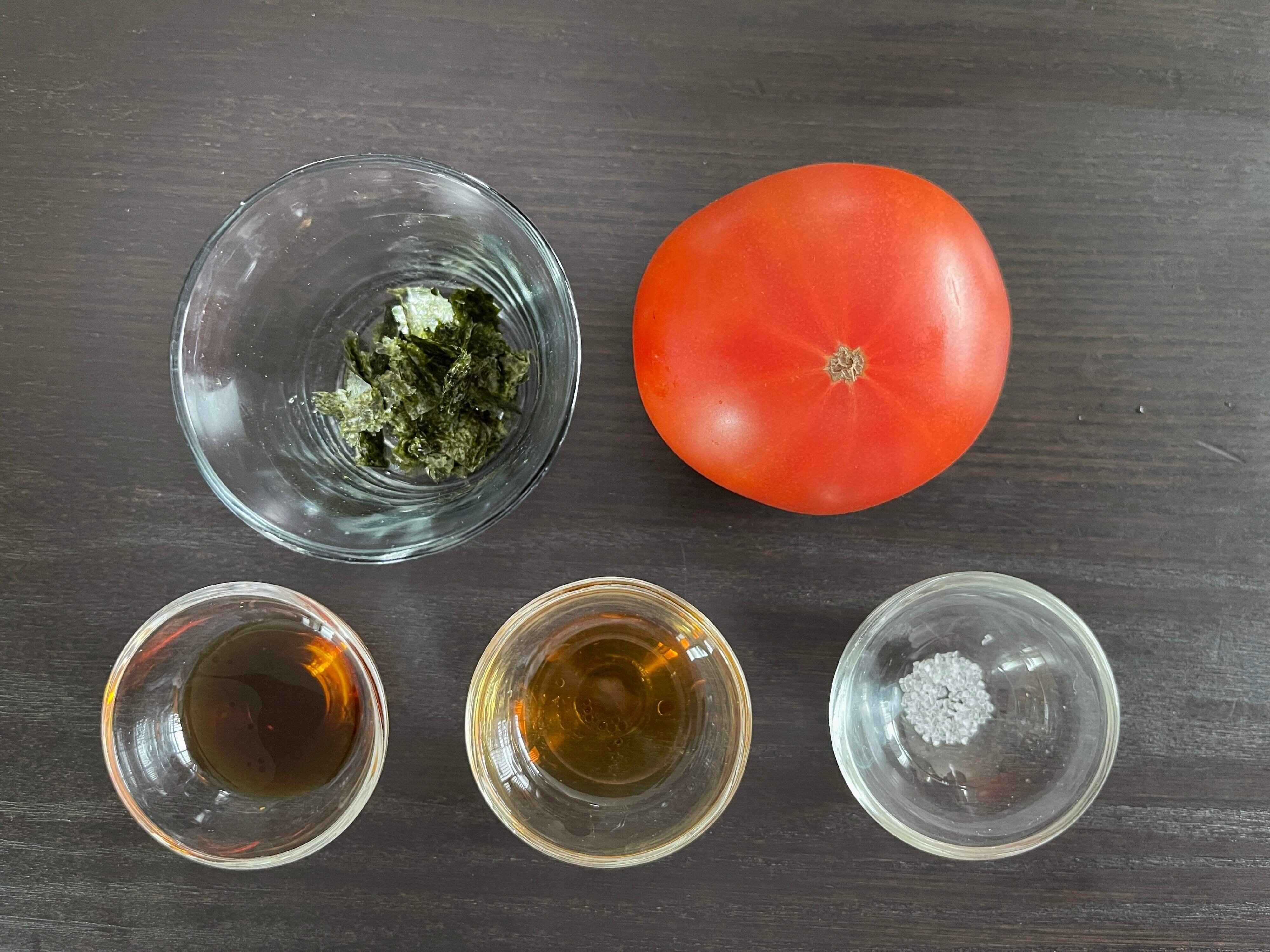 事前にトマトと調味料を合わせて冷蔵庫に入れておけば、食べる直前にお皿に盛って海苔をかけるだけ!