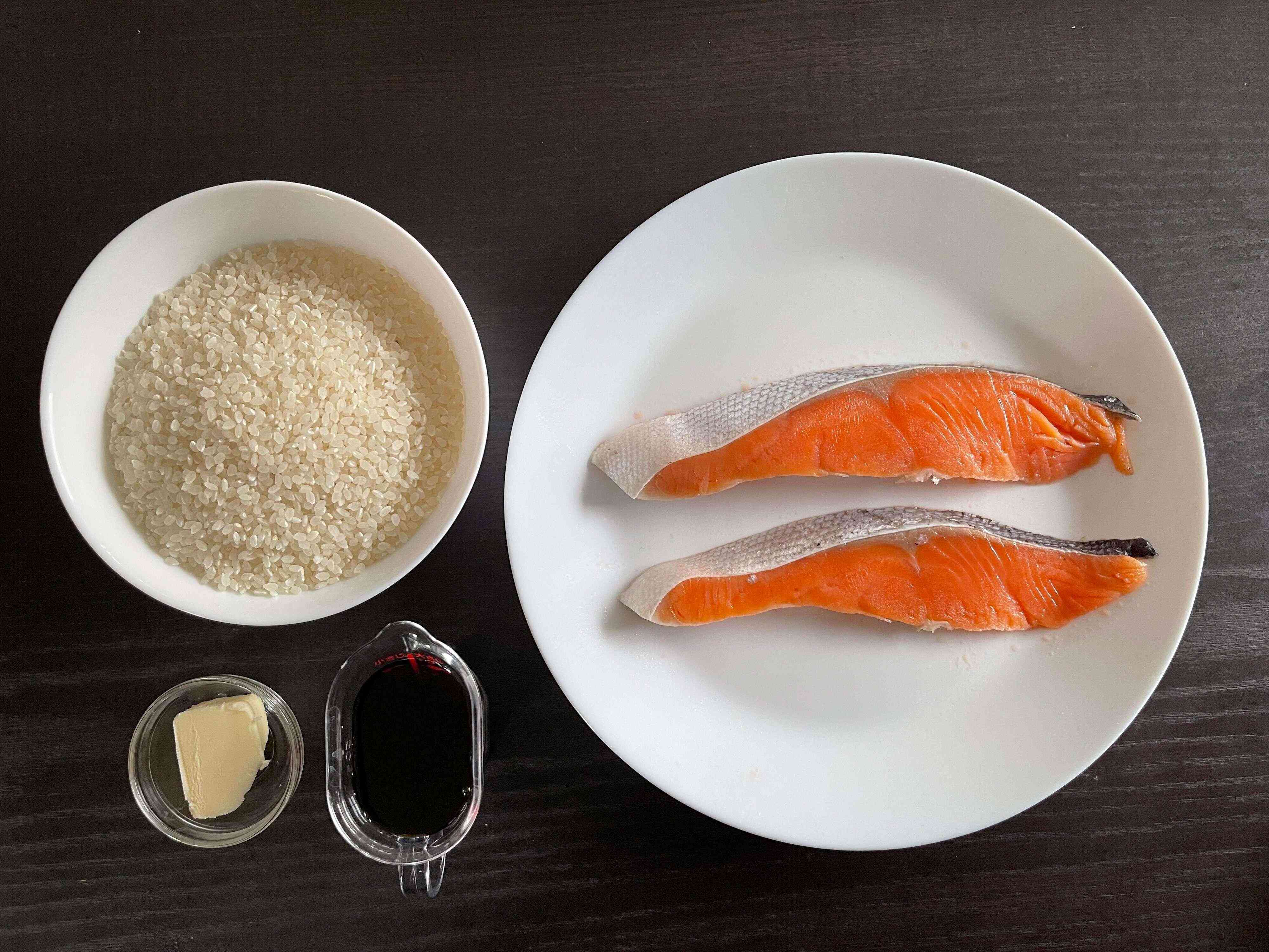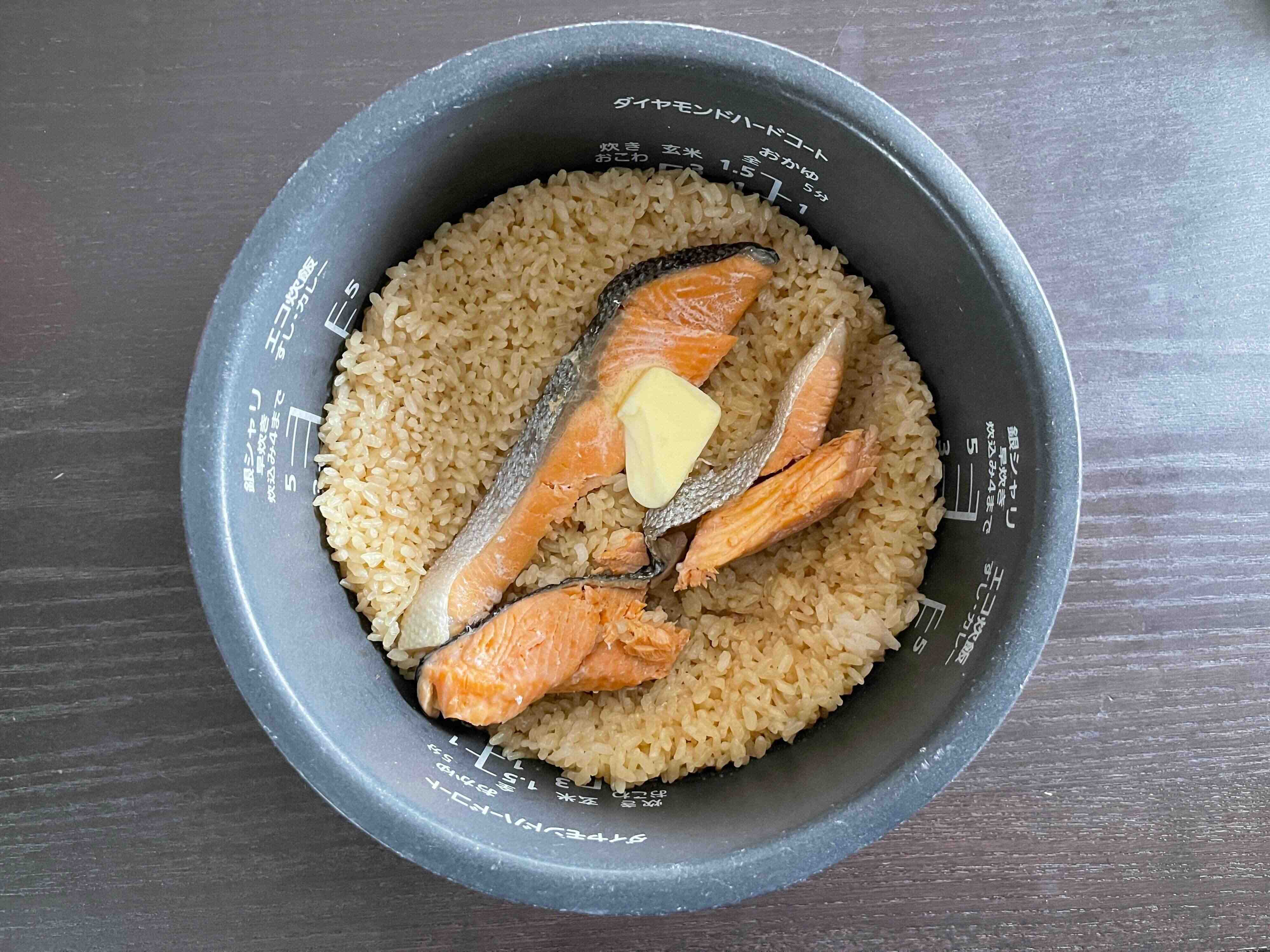 ごはんに鮭をのせて炊くだけの簡単レシピです。