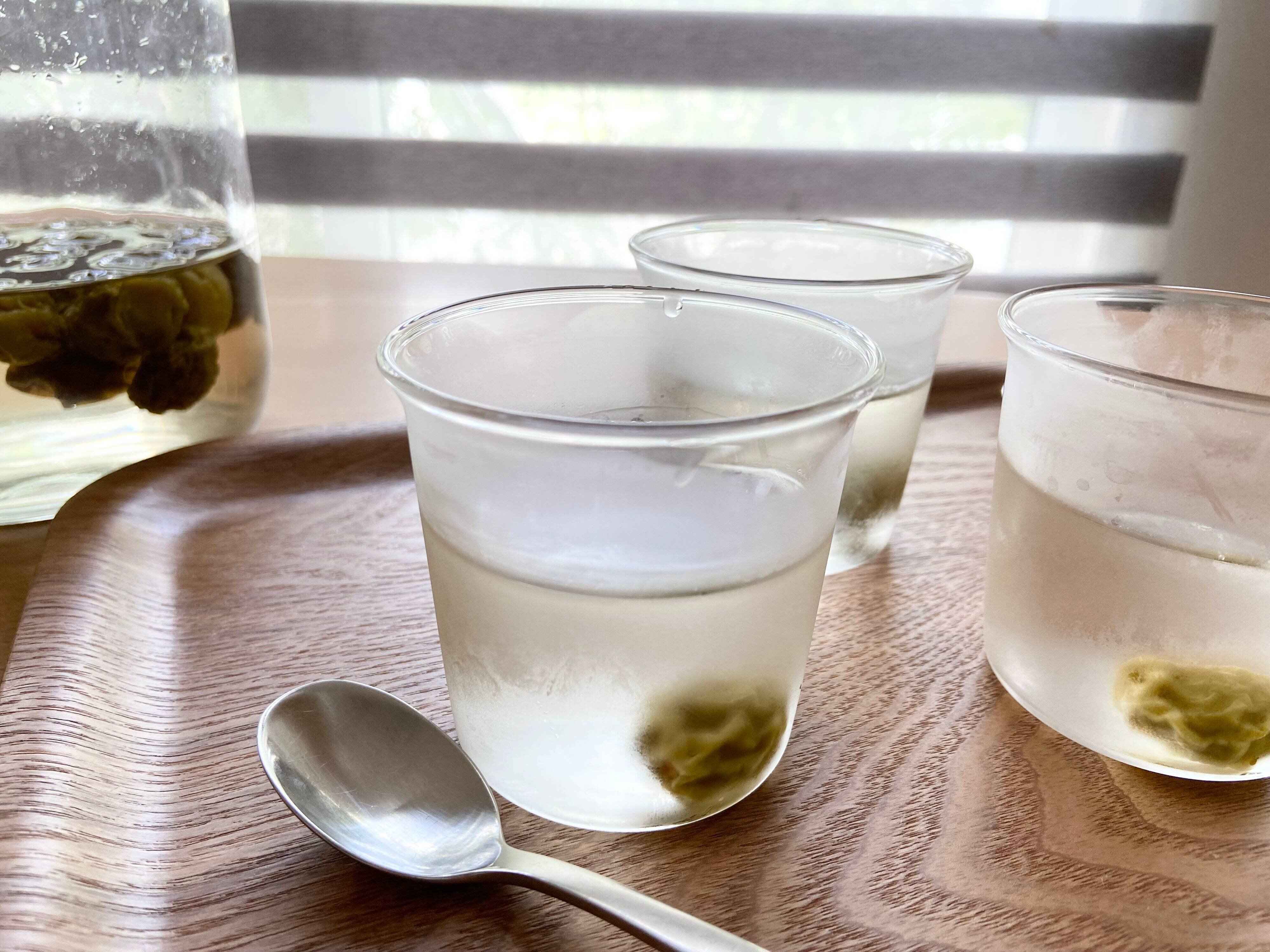 梅の水割りや炭酸割り以外にも、梅ゼリーやかき氷の蜜にしてもとっても美味しい梅シロップ。梅雨時期〜夏の疲れやすい時期の大人のおやつにぴったりで、お客様が来るような時には手軽に振る舞うことができます。
