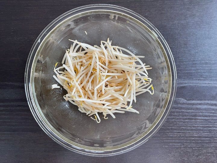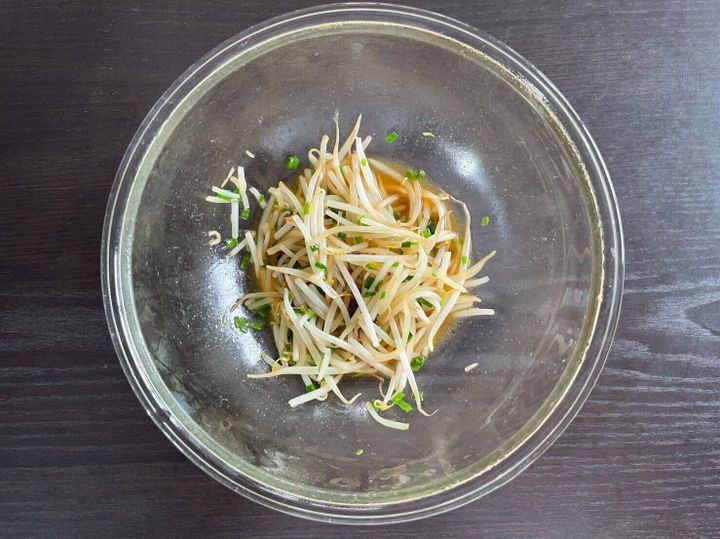(3)耐熱容器に(1)(2)と塩、ごま油を混ぜ合わせ、ラップをして600wで2分加熱する。
