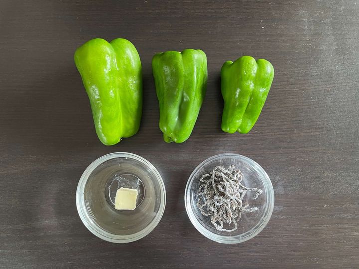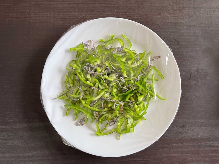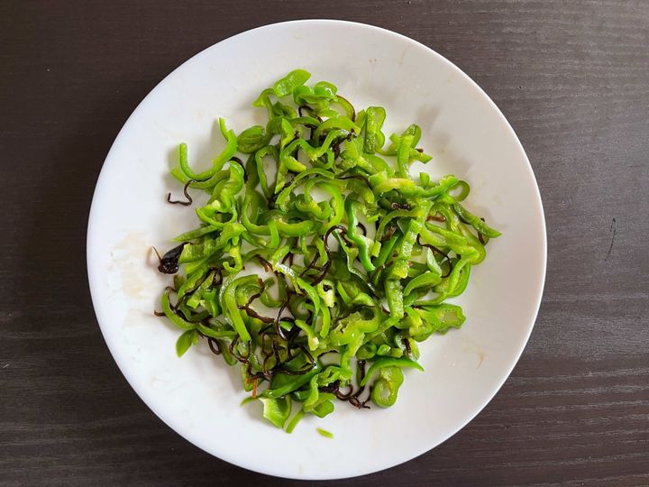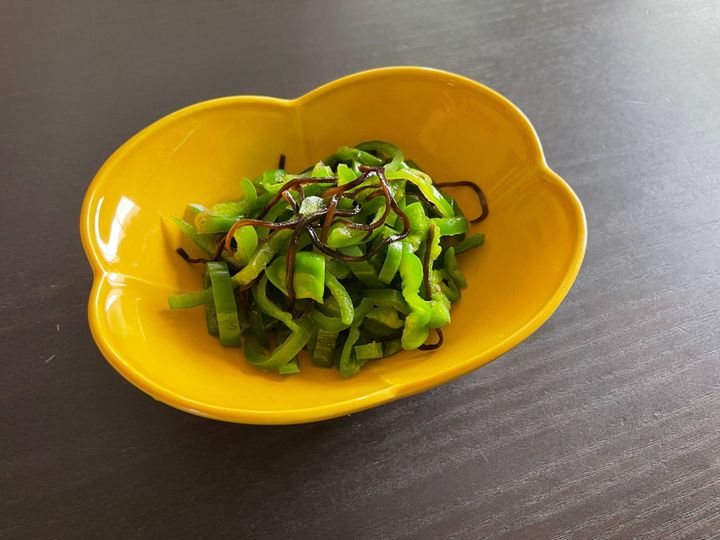 (1)ピーマンは細切りにし、塩昆布と混ぜ合わせ、ラップをして600Wで1分30秒加熱する。