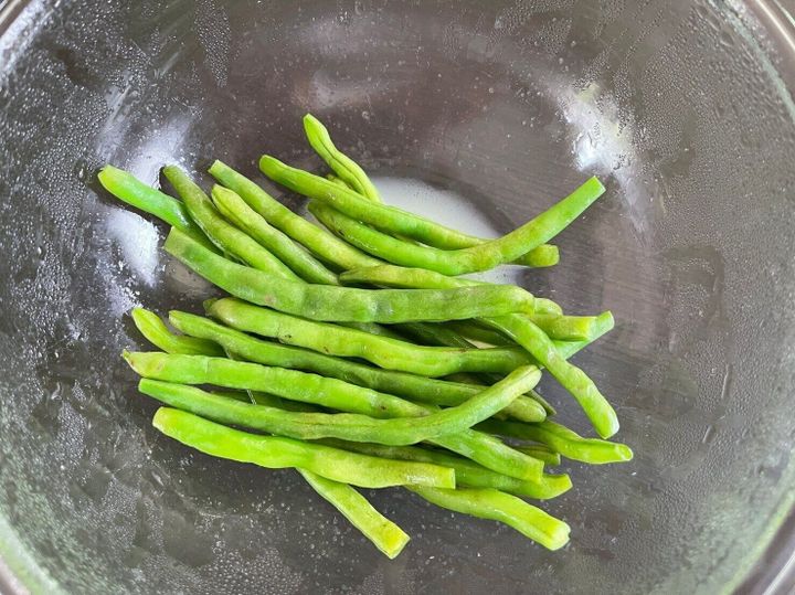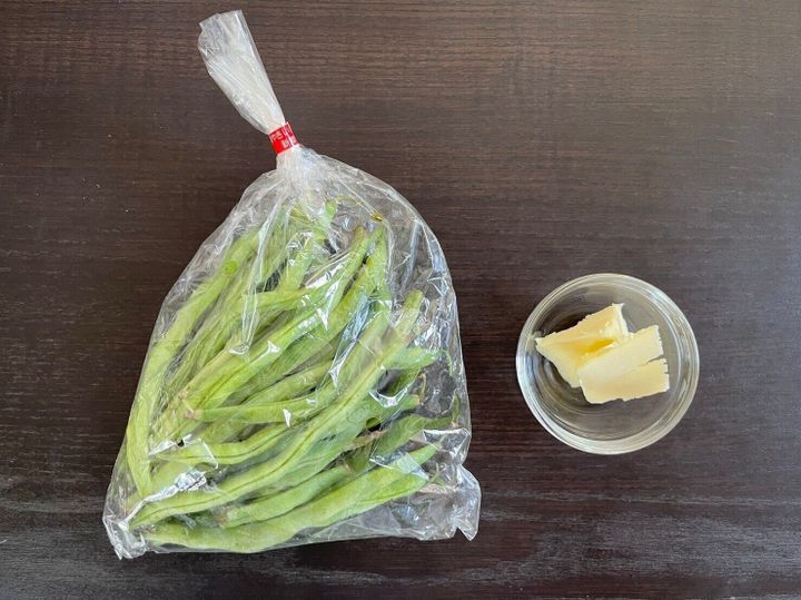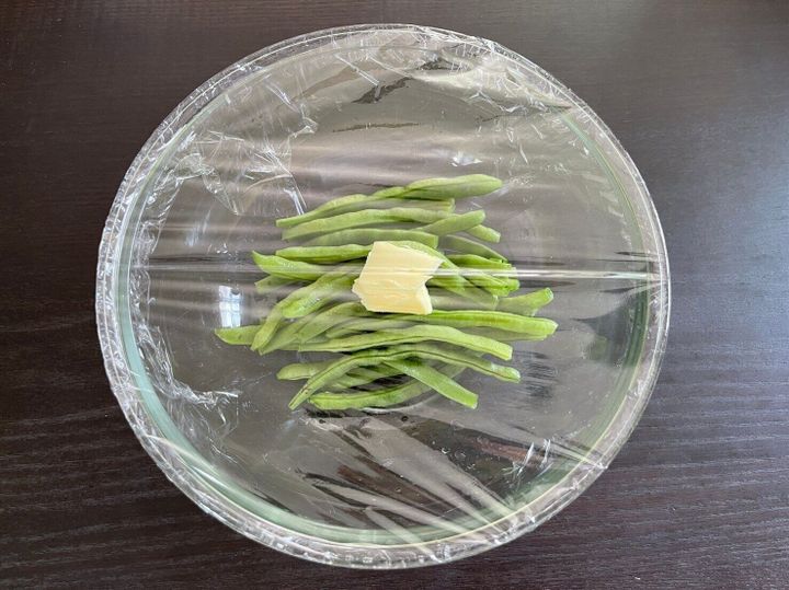 (1)耐熱皿にさやいんげんのヘタをとって入れ、
