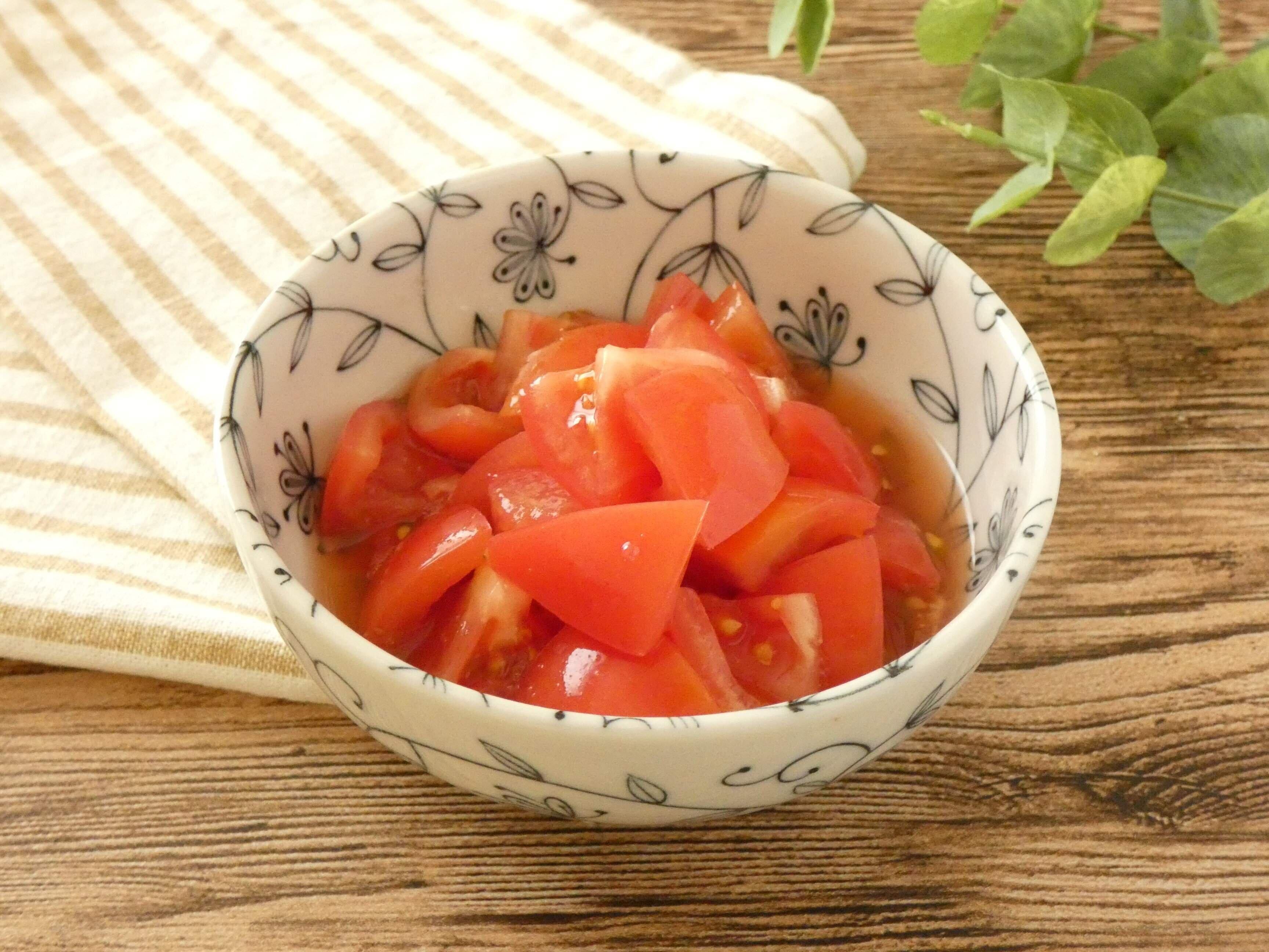 トマトを一口大に切り、すし酢と一緒にポリ袋へ入れます。15分くらいつけておけばOK。さっぱりとした1品があっという間に完成します。