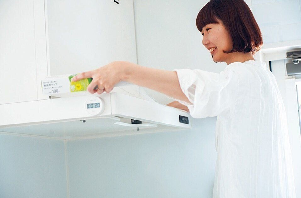 油汚れにホコリがこびりつくと、拭き取るのが大変な換気扇まわり。おさよさんは上部にラップをぴたりと貼りつけています。「気がついたときに取り換えるだけなので、簡単です」。