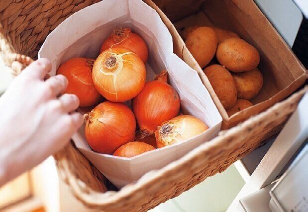 根菜をかごにまとめて入れているものの、底に散らばる土汚れを取るのは面倒。小さめの紙袋に入れてからかごにしまうだけで汚れが防止できます。汚れたら新しい紙袋に交換するだけ」。