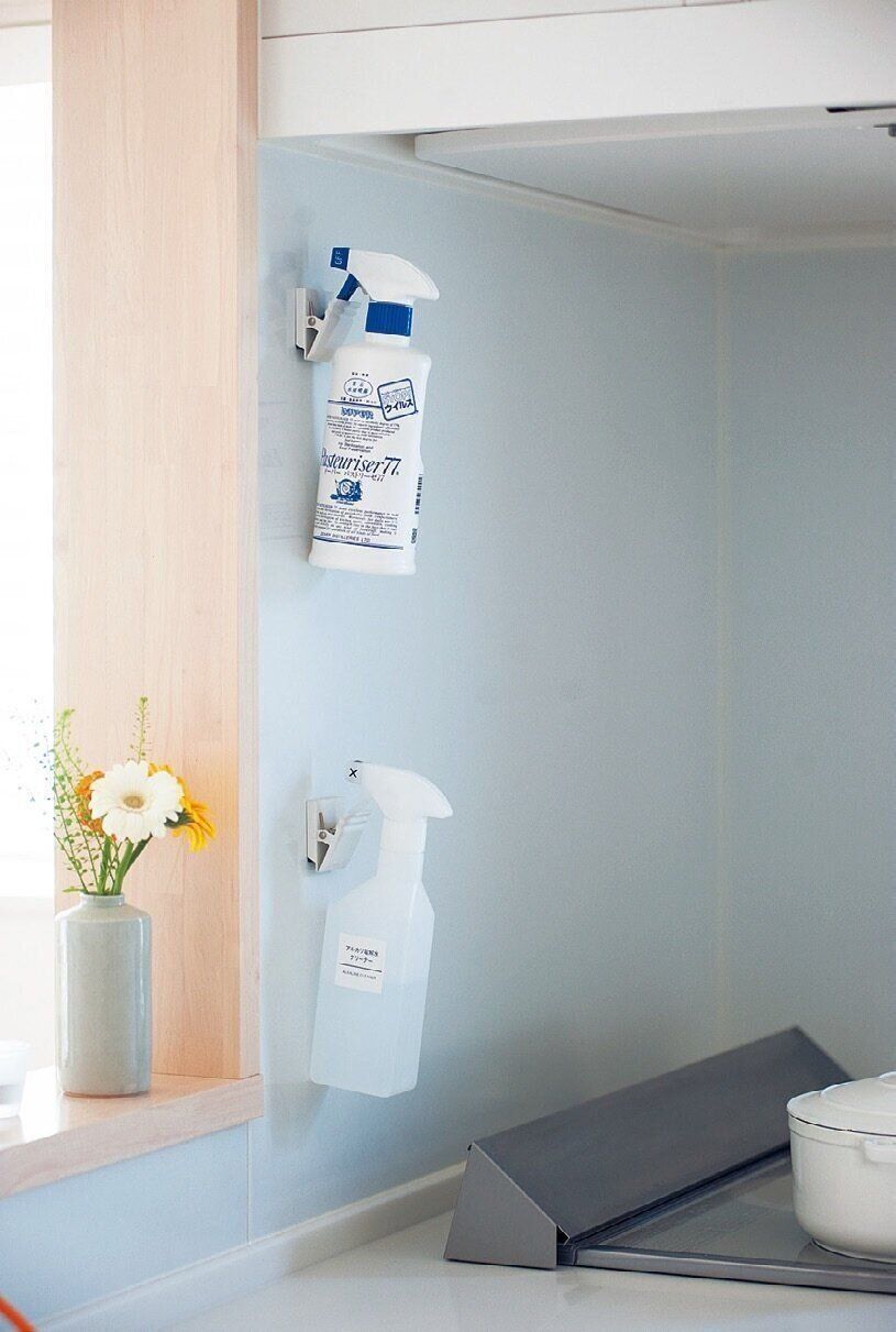 「キッチンに出しっ放しにする物を厳選し、掃除スプレーはマグネットクリップに引っ掛けてさっと取れるようにしました」。さらに古布をウエスにし、汚れをすぐに拭いて捨てられるようにしています。