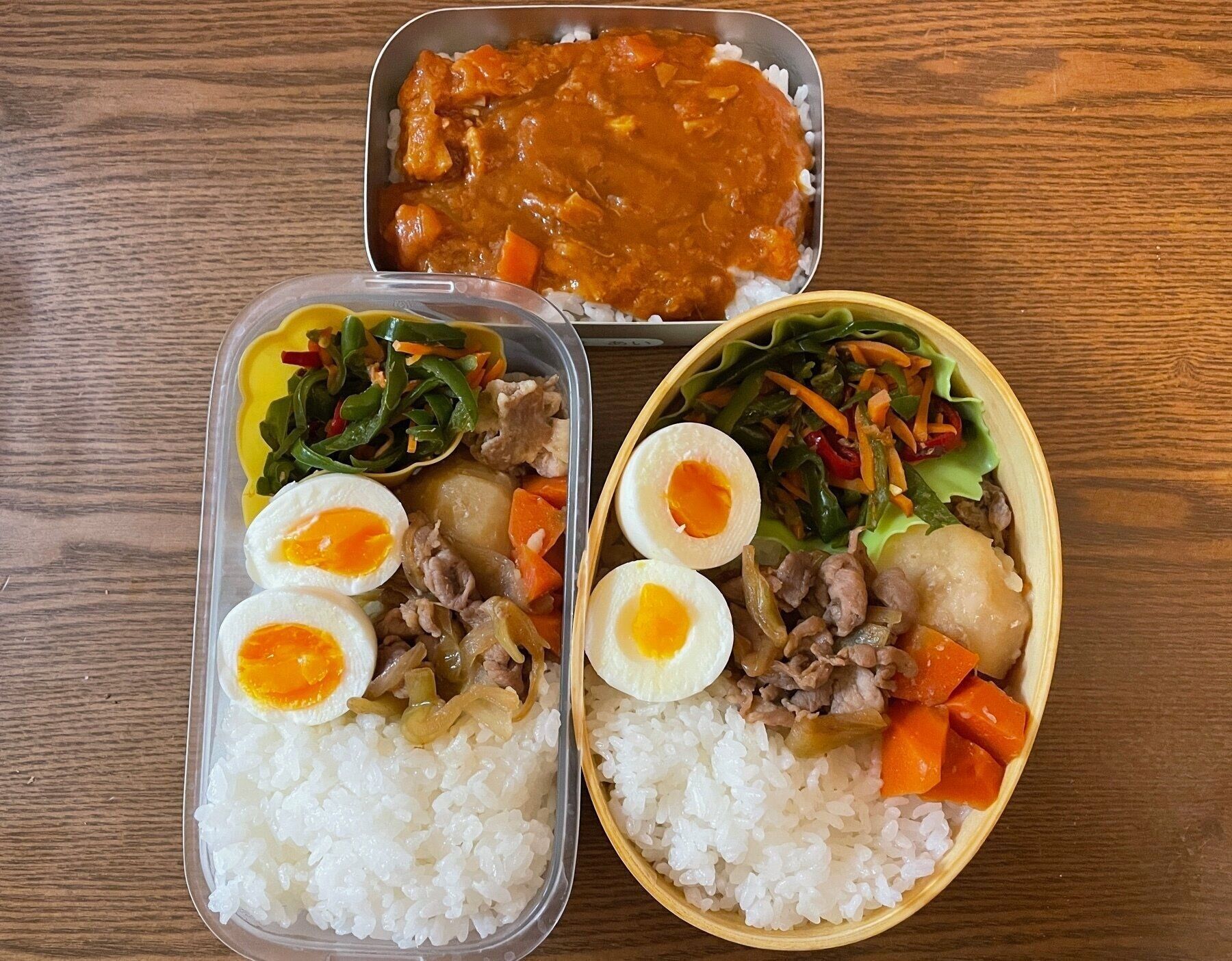 温められるお弁当箱にカレーをバーンと入れたり、卵焼きではなく、ゆで卵をドンと入れてもいいじゃないですか。気楽につくりましょう。