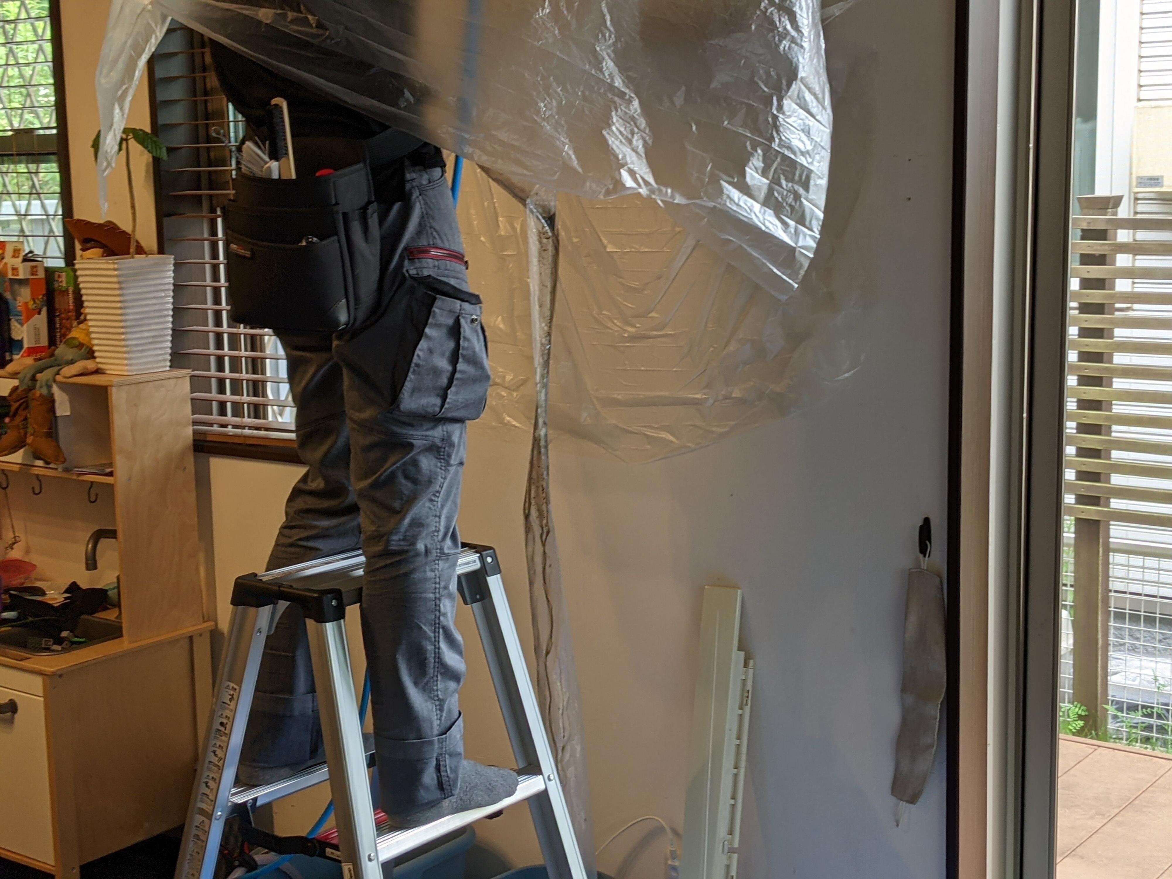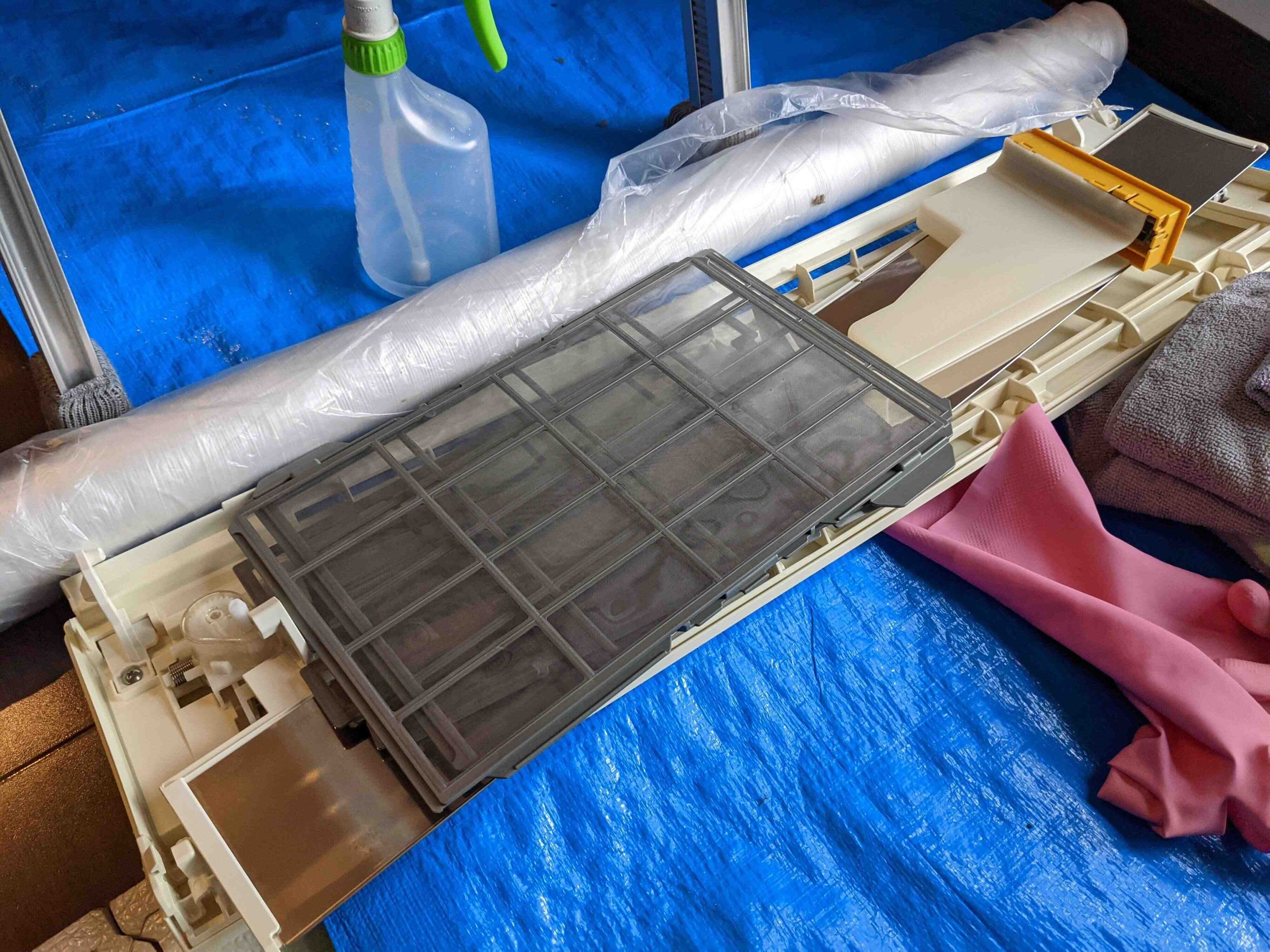 まずは周辺が汚れないようにシートを敷きます。エアコンのパーツをどんどん外し、家の外の水道で1人が洗浄していきます。その間にもう1人が養生を進め、エアコン内部の洗浄というような流れでした。