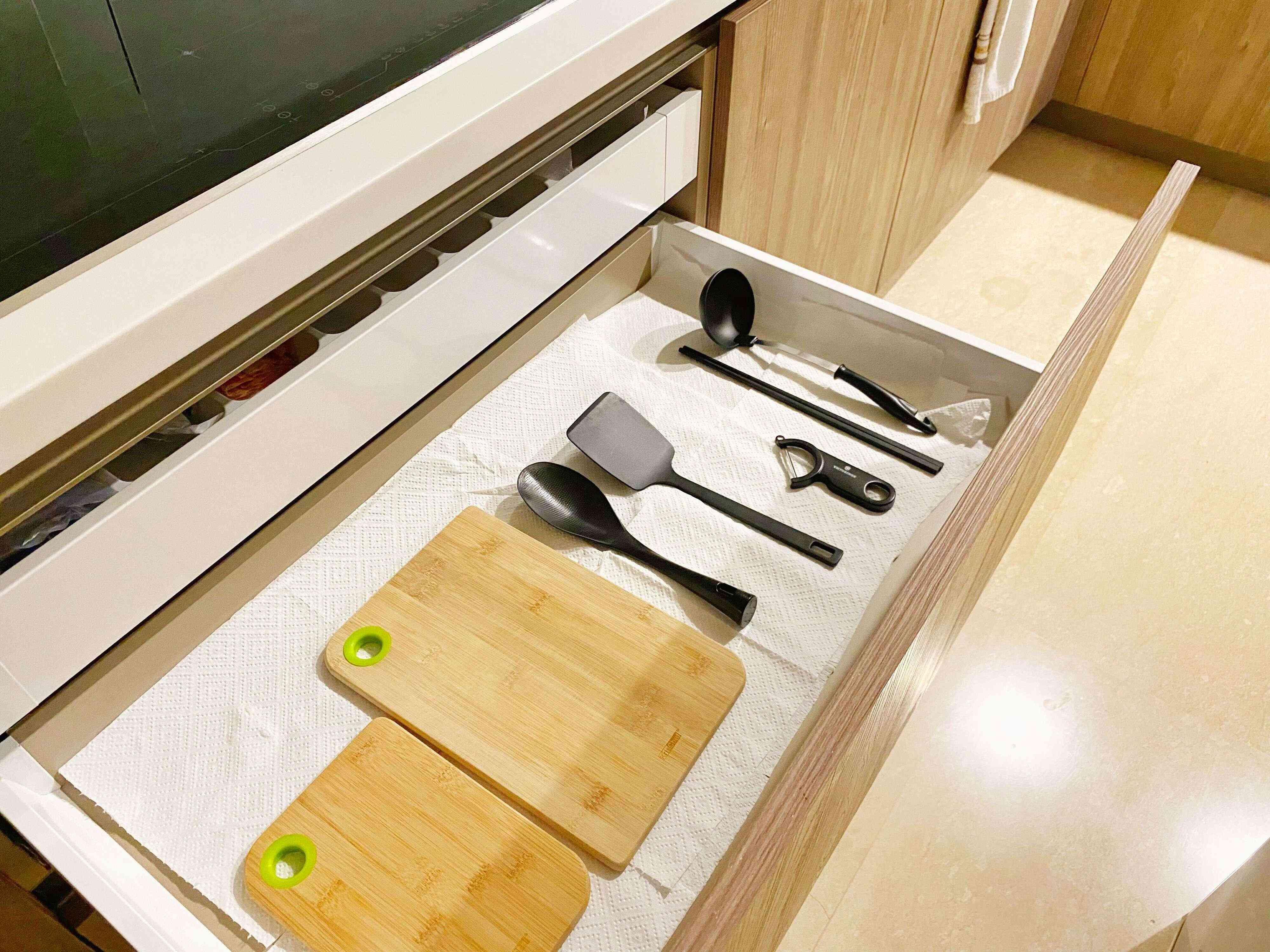 まな板だけは洗った後に乾燥させてから引き出しにしまうようにしています。水気を含んだまま収納してしまうと、引き出しの中がカビてしまいます。