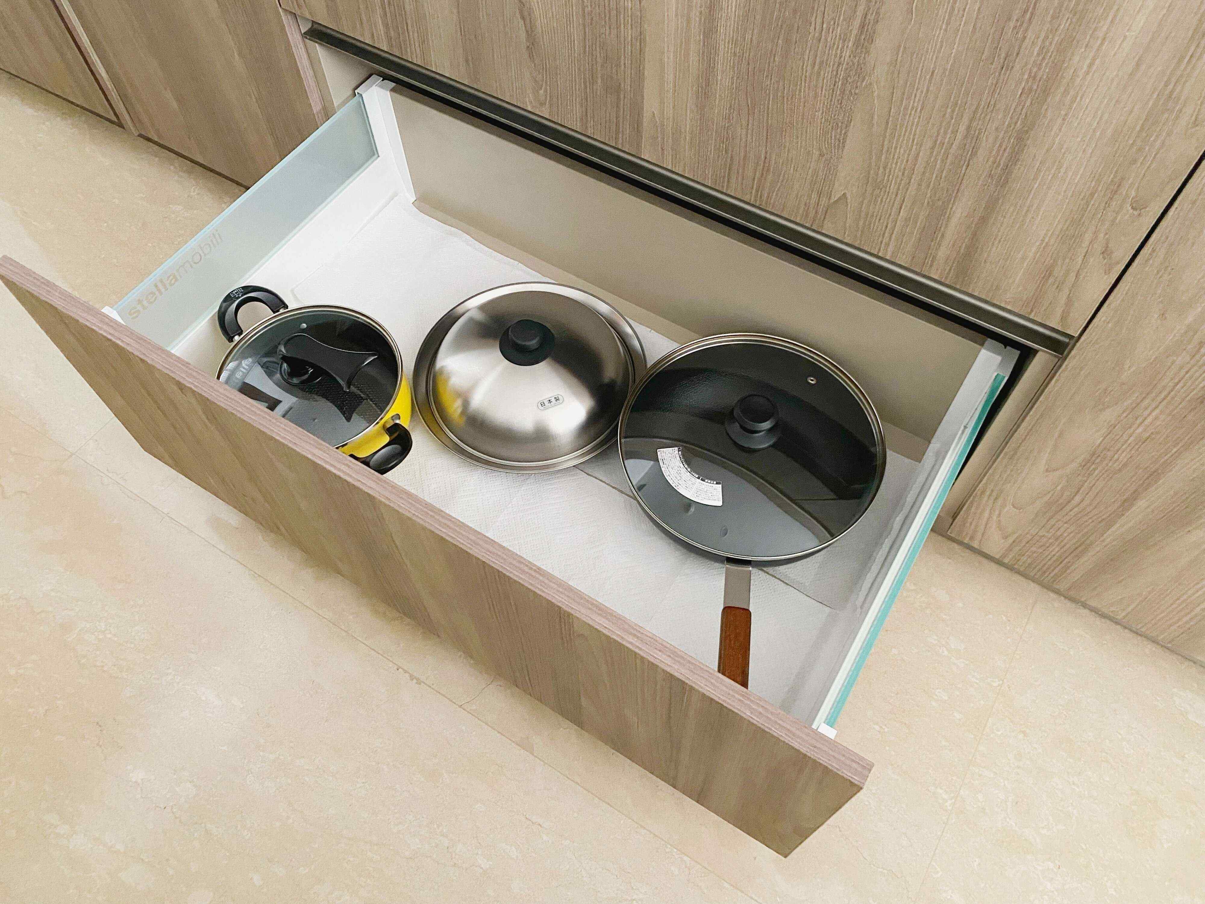 私も引っ越しを機に複数あったフライパンを一つに絞りました。収納グッズも必要なく、引き出しにしまうだけなので取り出しやすく、しまいやすくなりました。