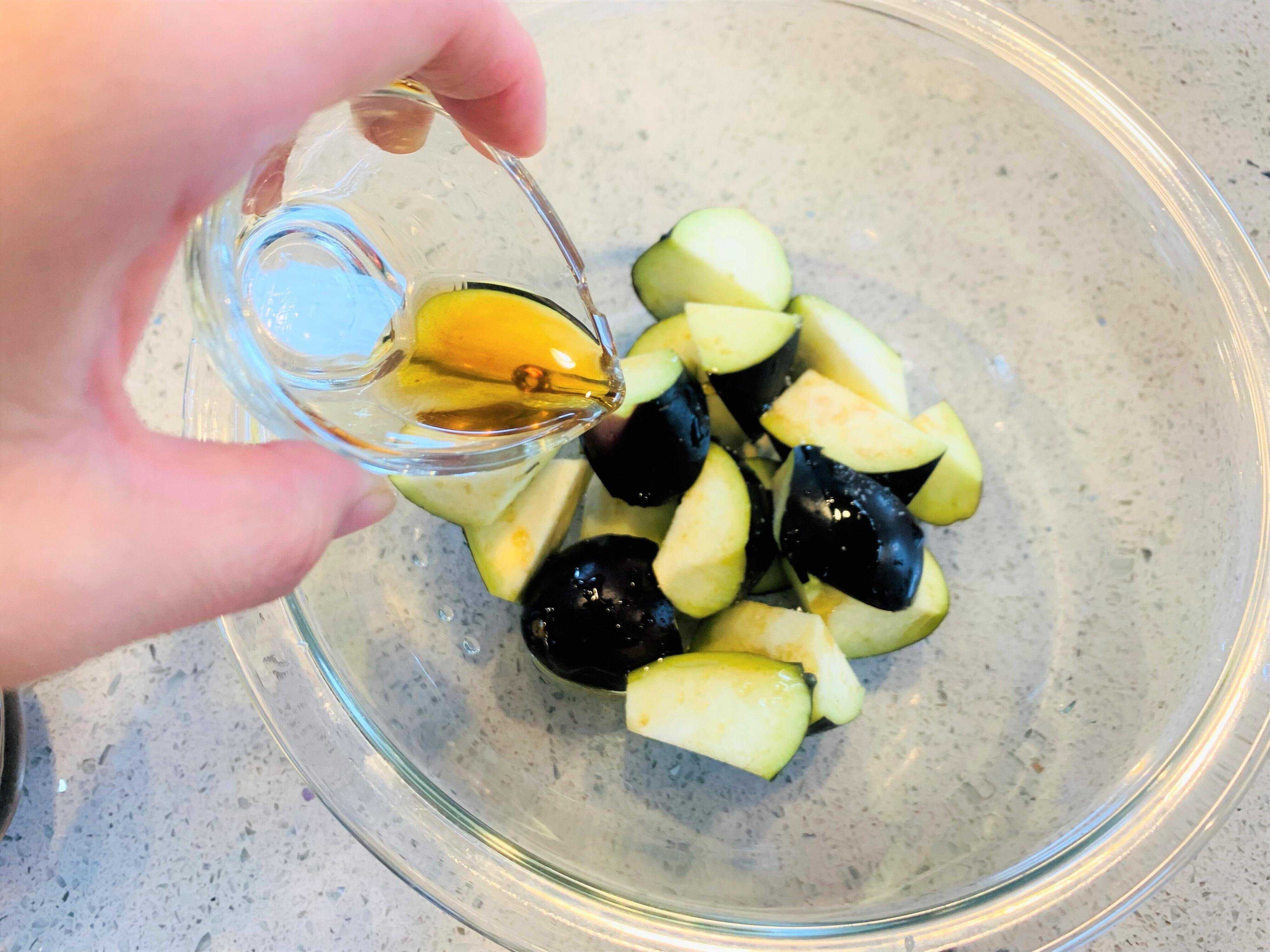 なすは乱切りにして耐熱ボウルに入れ、ごま油と塩を絡めます。