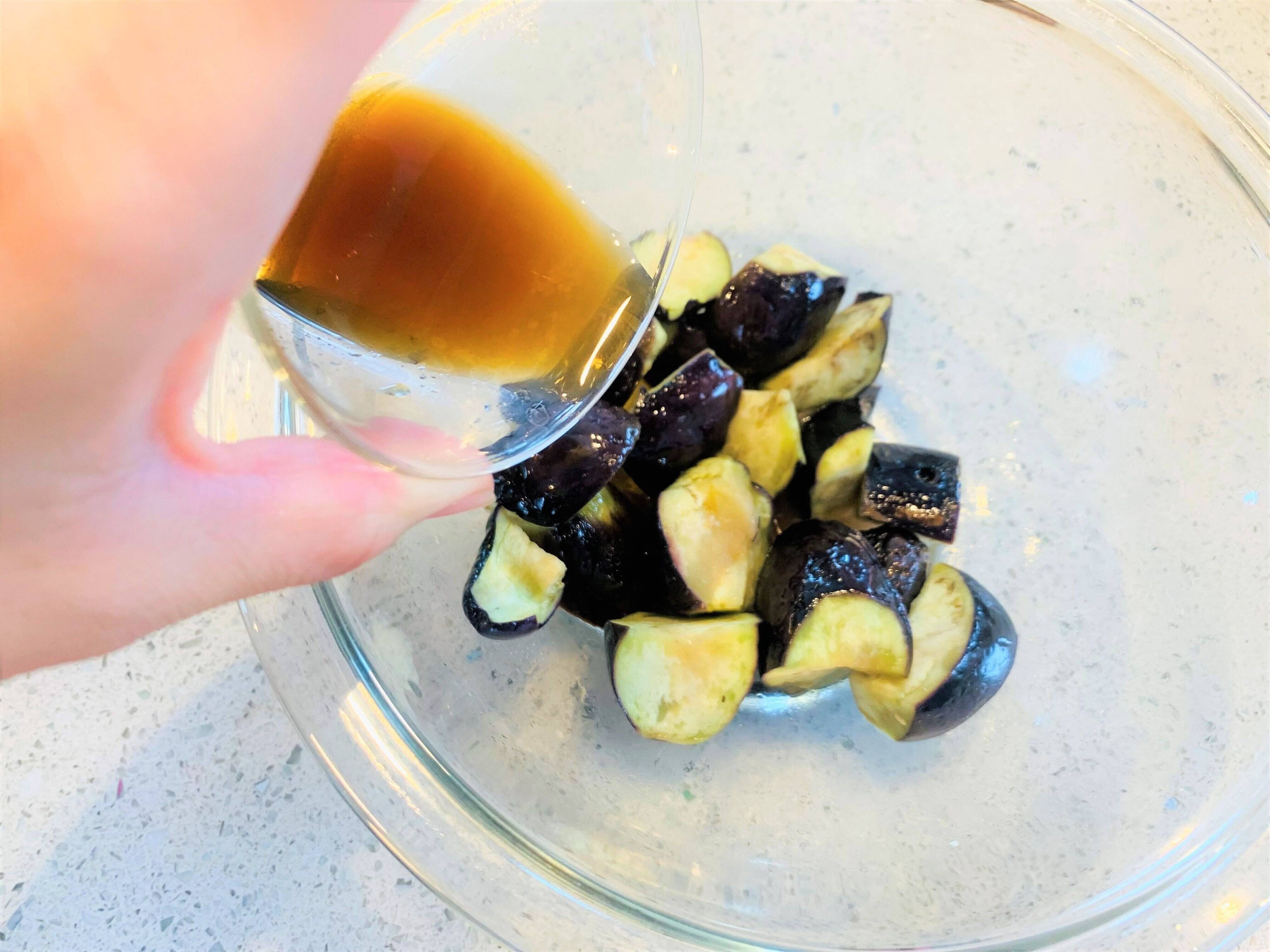 ポン酢と砂糖を混ぜておき、なすが熱いうちに和えて仕上げます。