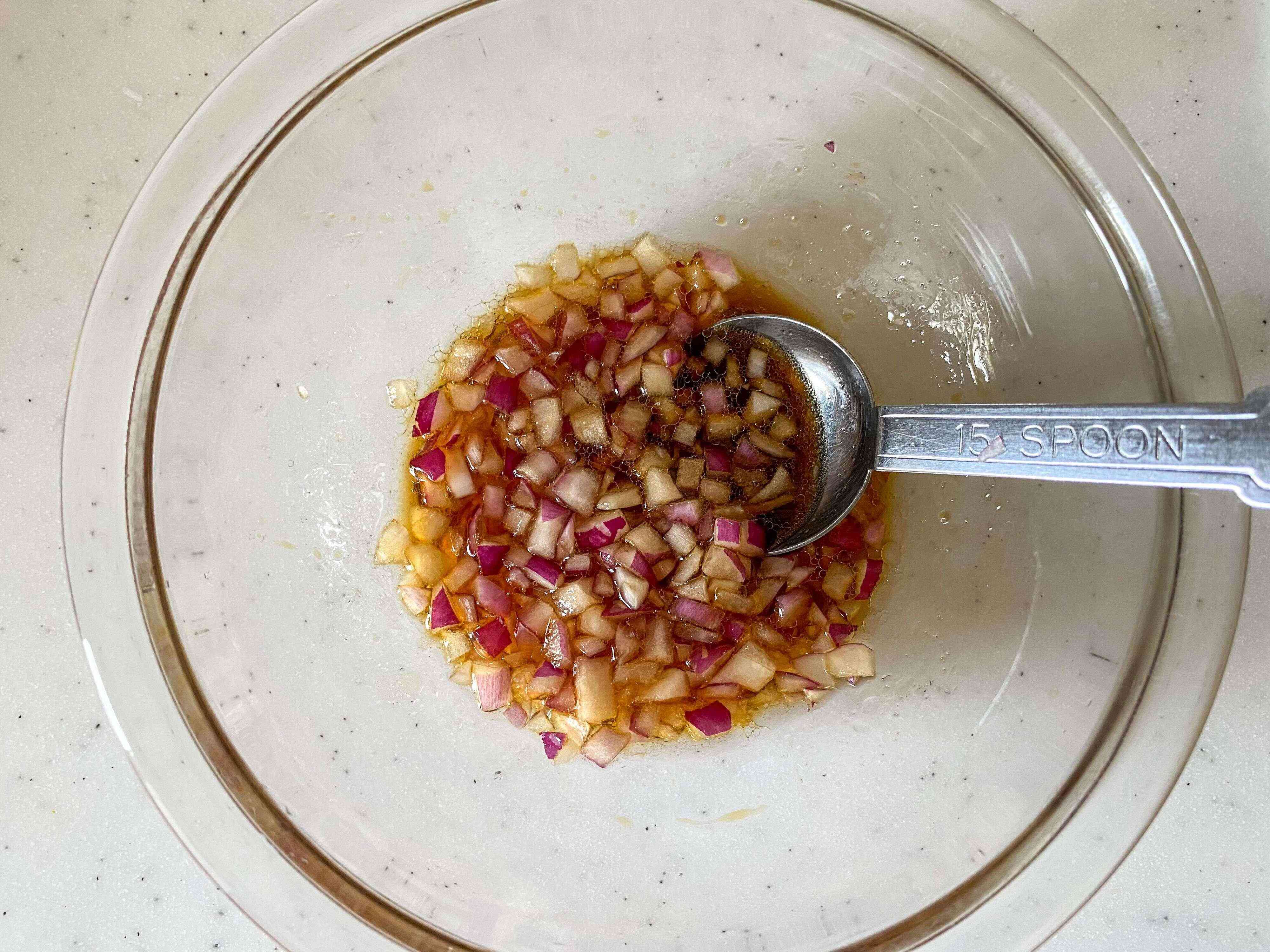 (2) ボウルにぽん酢、砂糖、ごま油を混ぜ合わせ、みじん切りにした紫玉ねぎを加えて混ぜる。