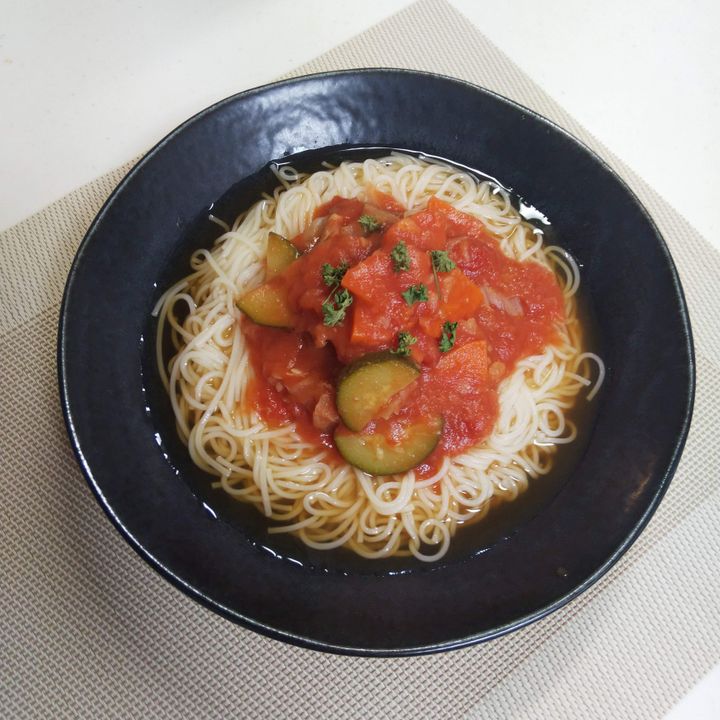 3つめはそうめん×トマト缶。トマト缶だけでは味気がないので、お好きな野菜とコンソメを入れてトマトスープをつくったものをかけるのがおすすめ!