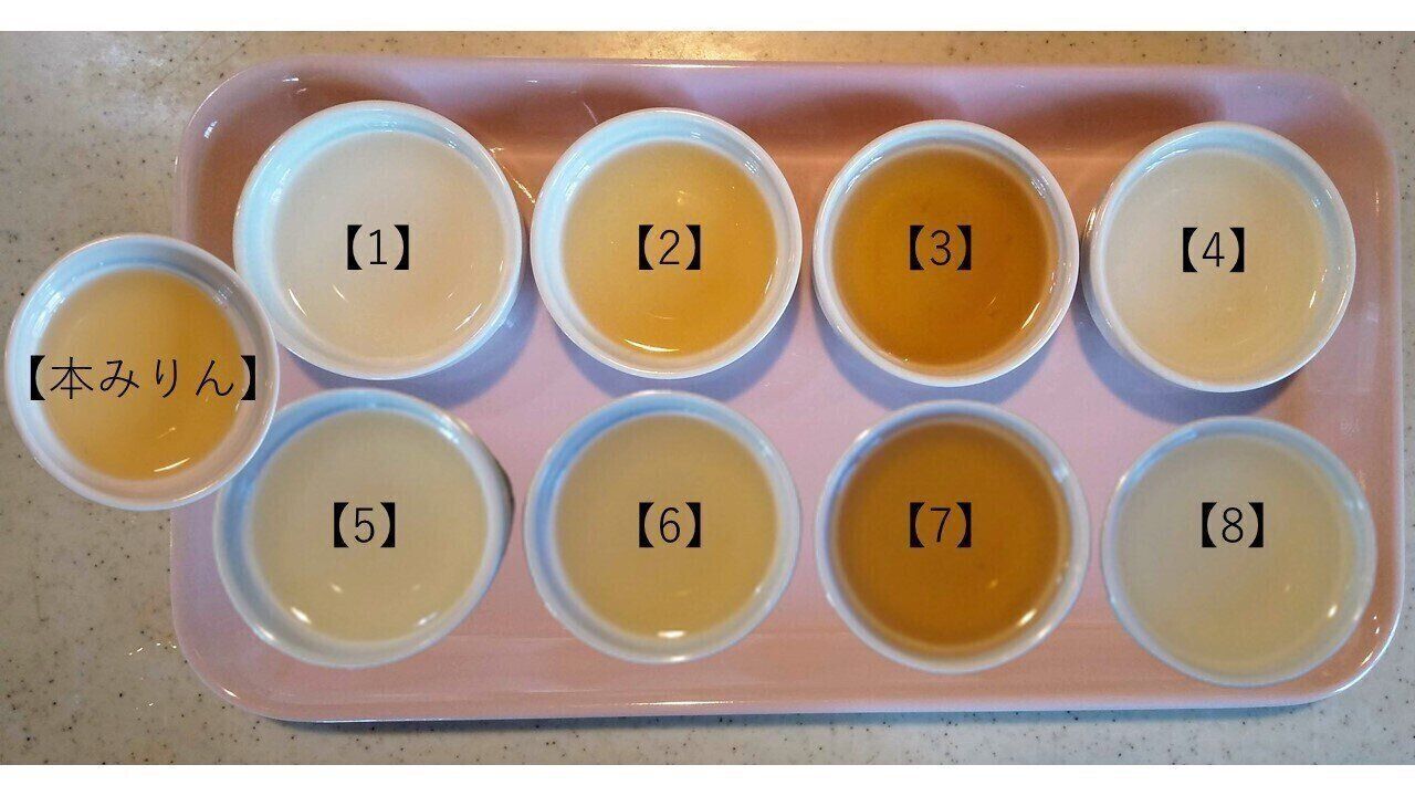 画像左中央が「本みりん」、上段左から順に【1】~【4】、下段左から【5】~【8】の混ぜ合わせたものを並べてみました。