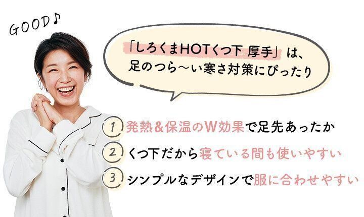 北極でも寒さを感じないしろくまの毛を応用した保温効果の高い繊維と、伸縮糸、そして特殊な発熱繊維を用いた3層構造で、足先を寒さからガード! 寒くてなかなか寝つけないときやフローリングの冷たさがつらいときも、はいておくだけでOKだからラク。