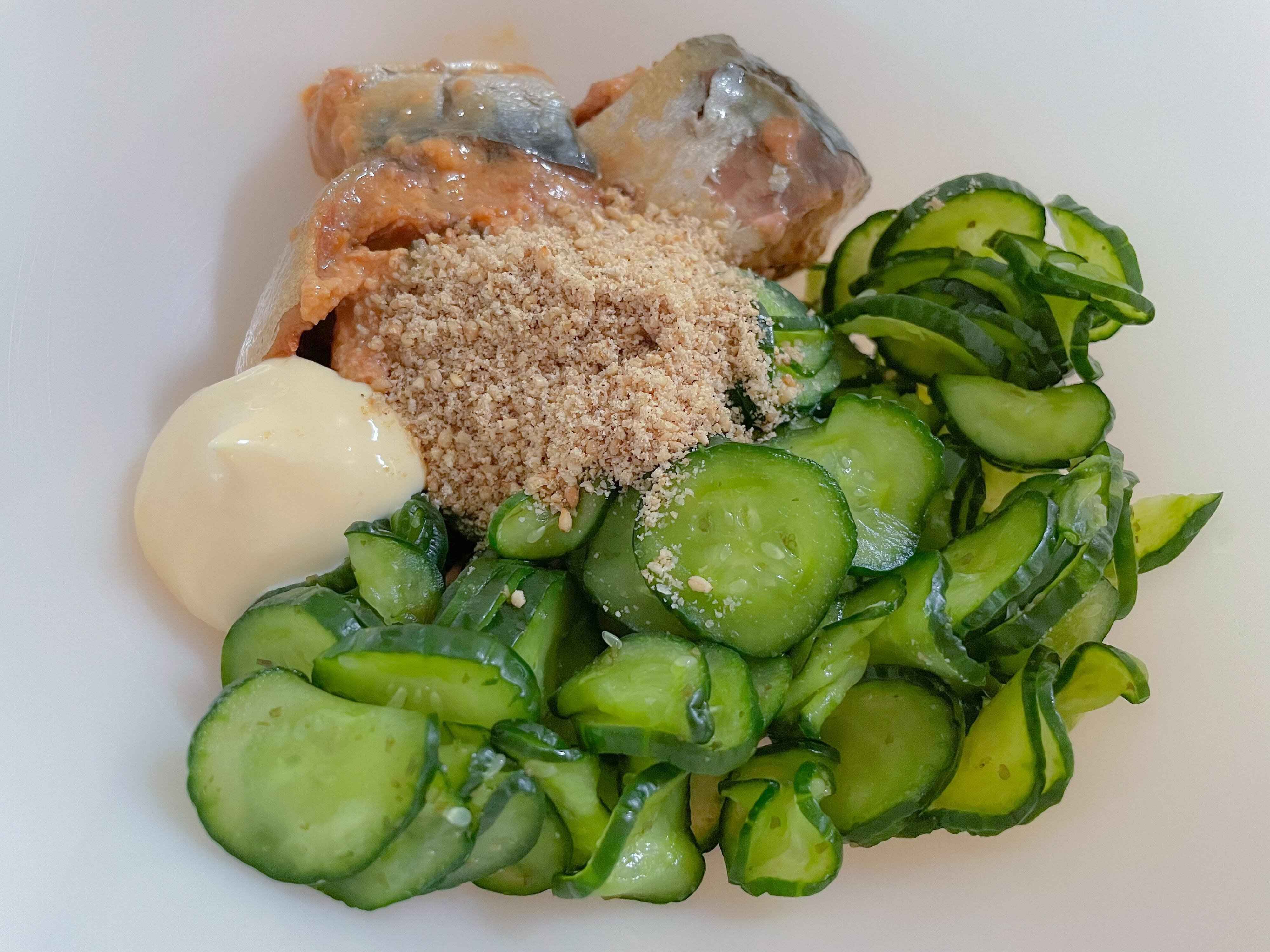 (3) ボウルに塩もみしたきゅうり、鯖、マヨネーズ、すりごまを入れる。