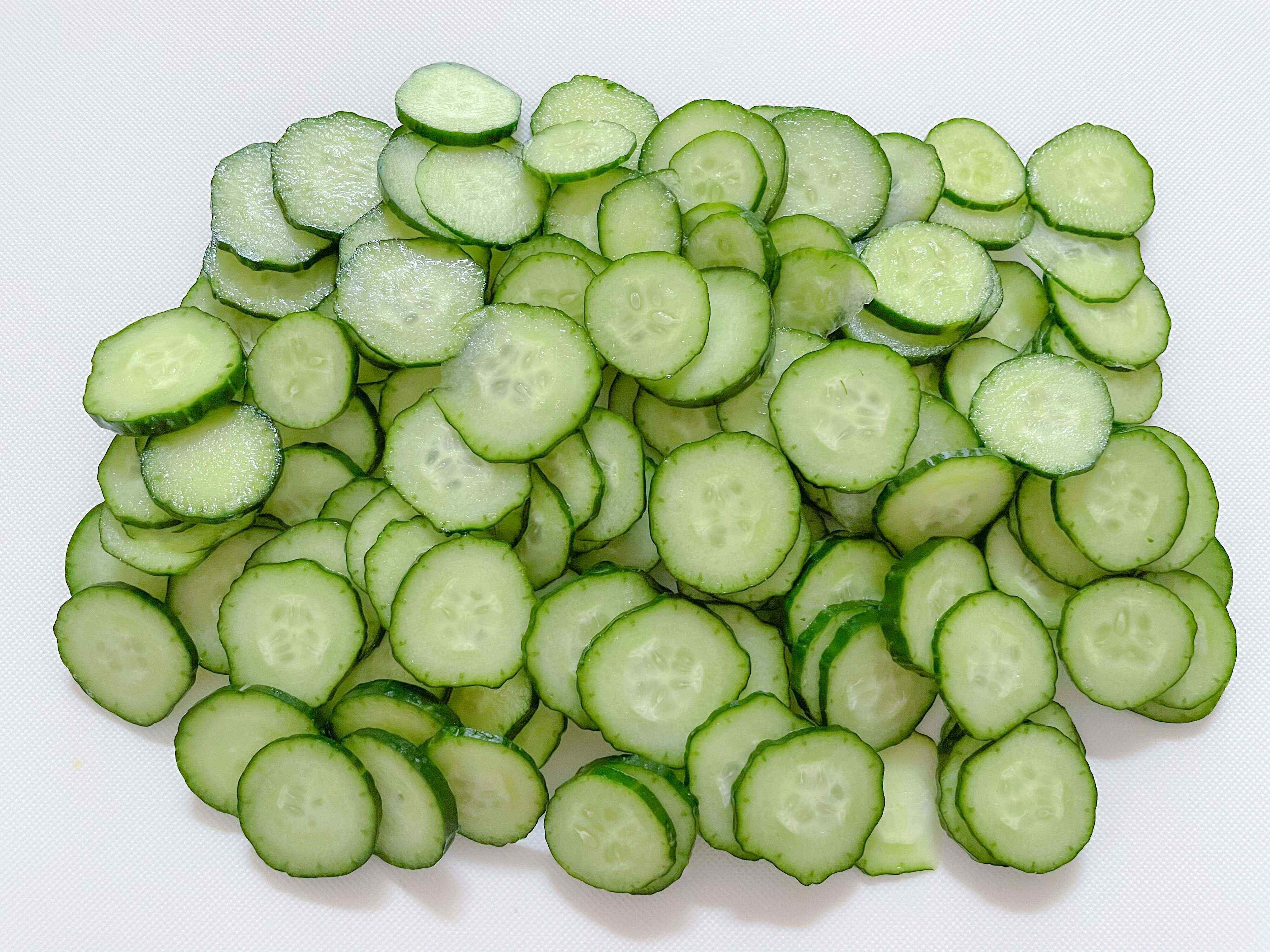 (1) きゅうりはアク抜きをして、3mm程度の輪切りにする。酢の物にするときよりも、少し厚めが食感も◎。
