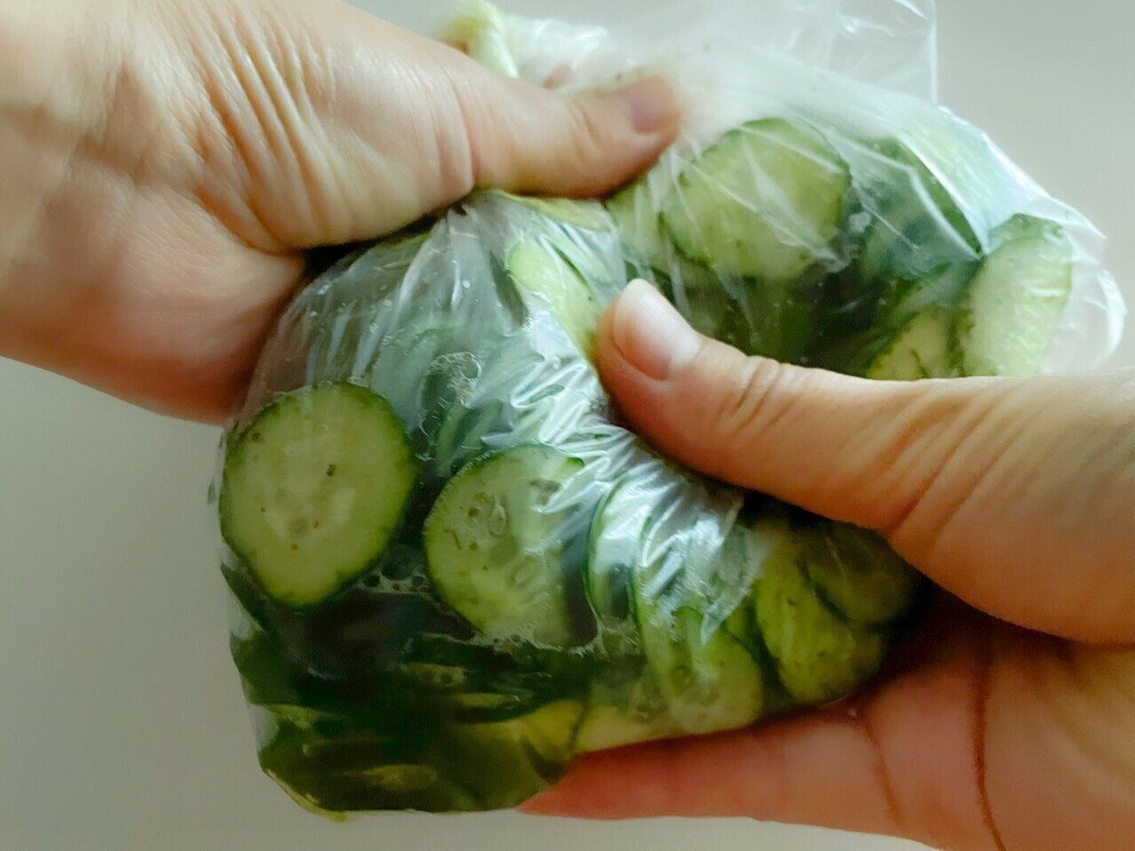 (2) ポリ袋にきゅうりと塩を入れ、塩もみして水気をきる。ポリ袋で塩もみすると、短時間で水が出て、塩の量も少なくてすみます。