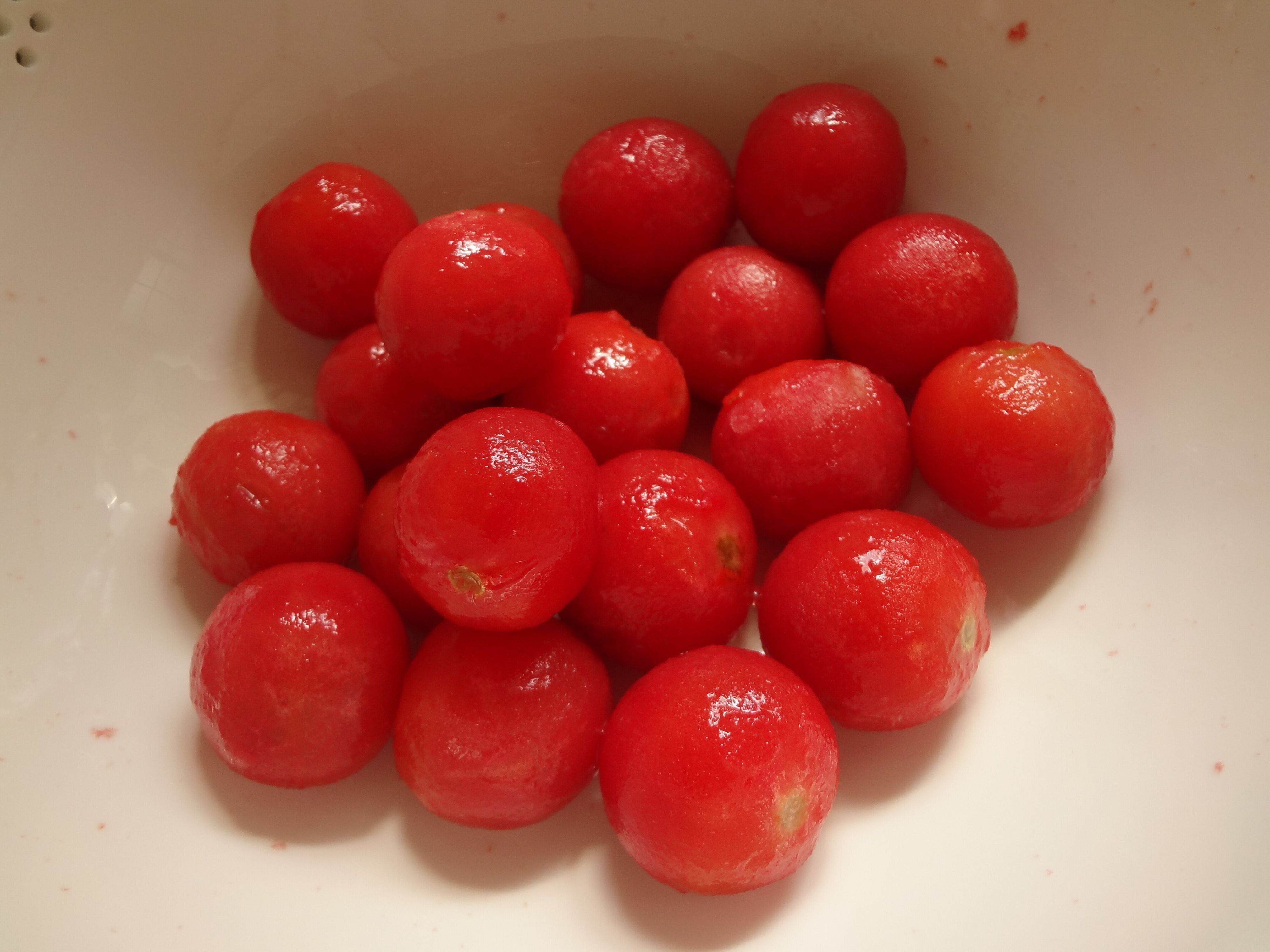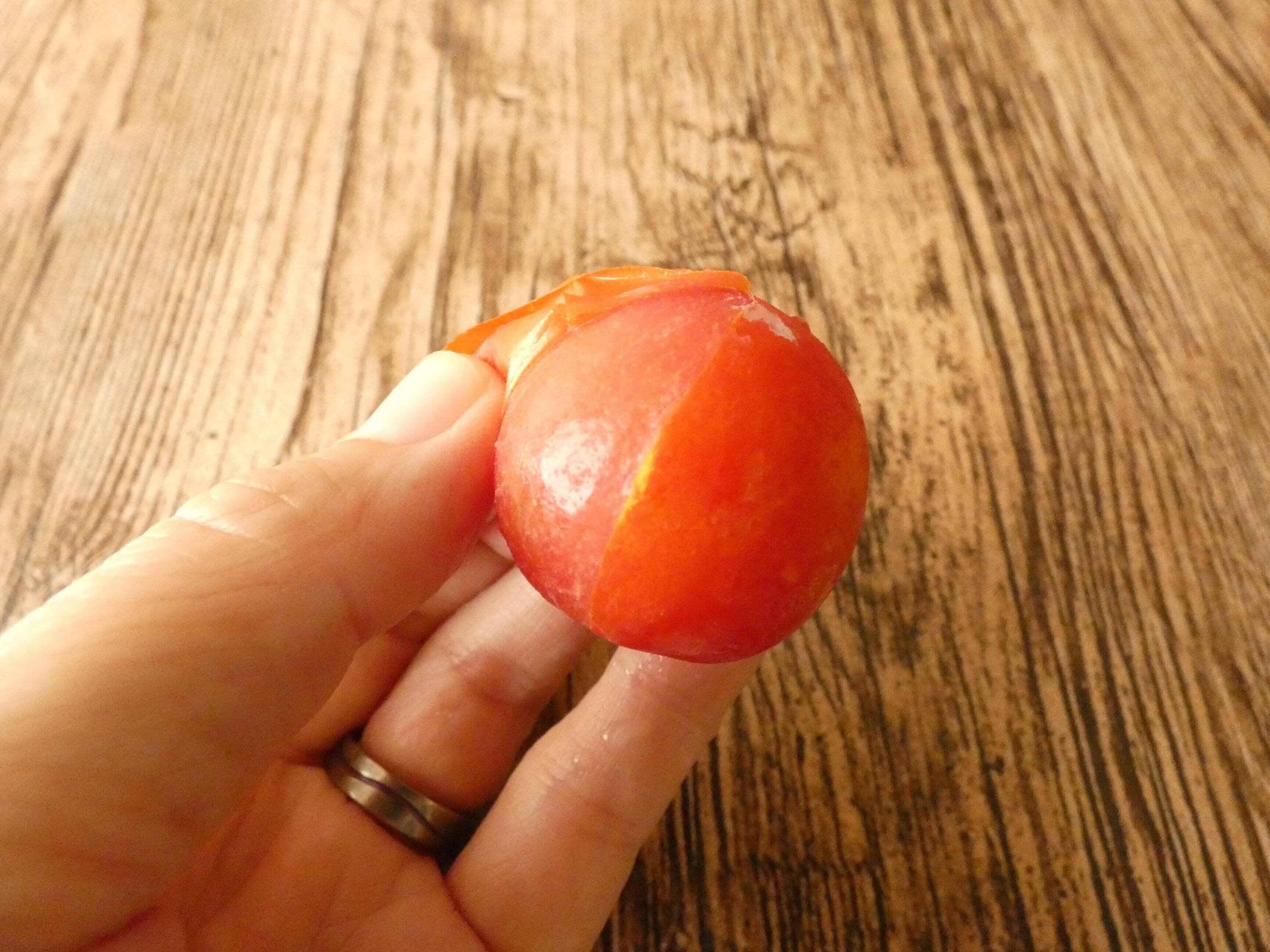 1.凍らせたミニトマトを少し水につけて皮をむきます。