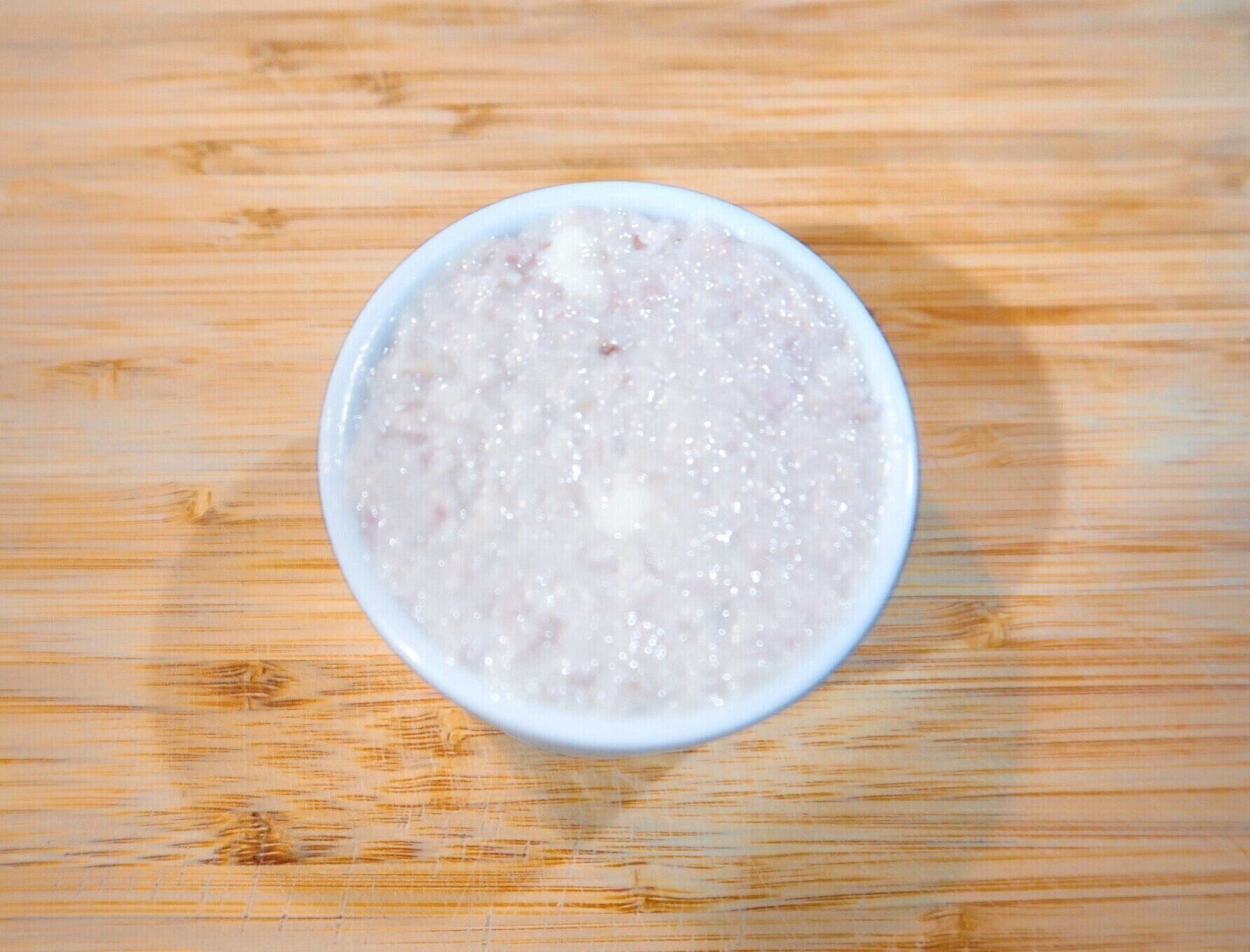 牛乳、にんにくのすりおろしを加え、練るようにして全体をよく混ぜ合わせます。味見をして塩、こしょうで味を整えます。