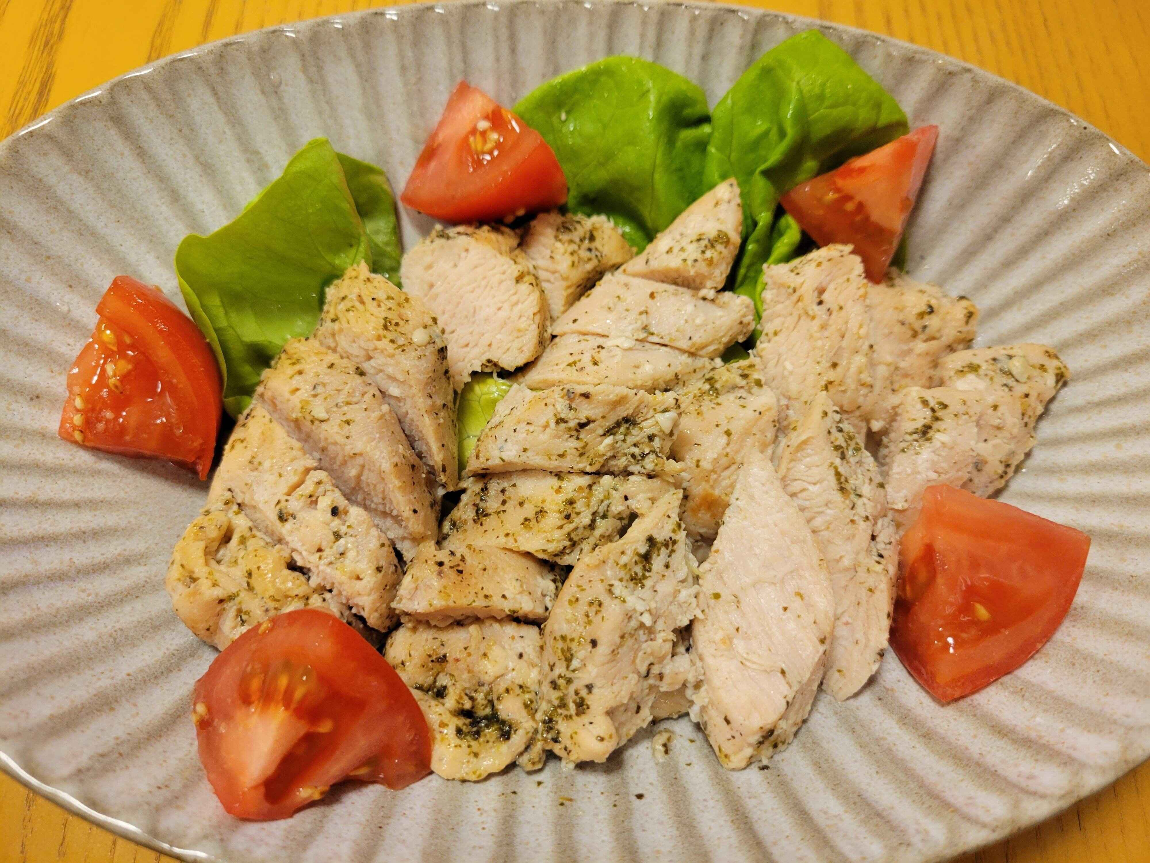 甘酒(大さじ2)と梅酢(大さじ1)、塩(小さじ1/3)、ブラックペッパー(少々)を混ぜたものに漬け込んだ鶏むね肉(約300g)を、フライパンで蒸し焼き(料理酒を入れて酒蒸し)にして、仕上げにオレガノペーストを入れて味をととのえます。オレガノの香りがよいアクセントになった蒸し鶏ができあがります。