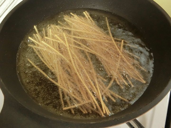 1.フライパンに油を熱し、パスタを入れます。(長い場合は半分に折ります)