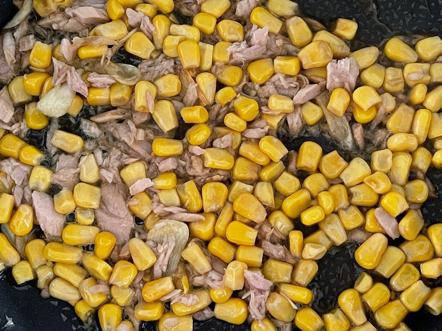 (3)とうもろこしを入れてざっと混ぜ合わせ、ツナ缶、めんつゆを加えて混ぜ合わせる。