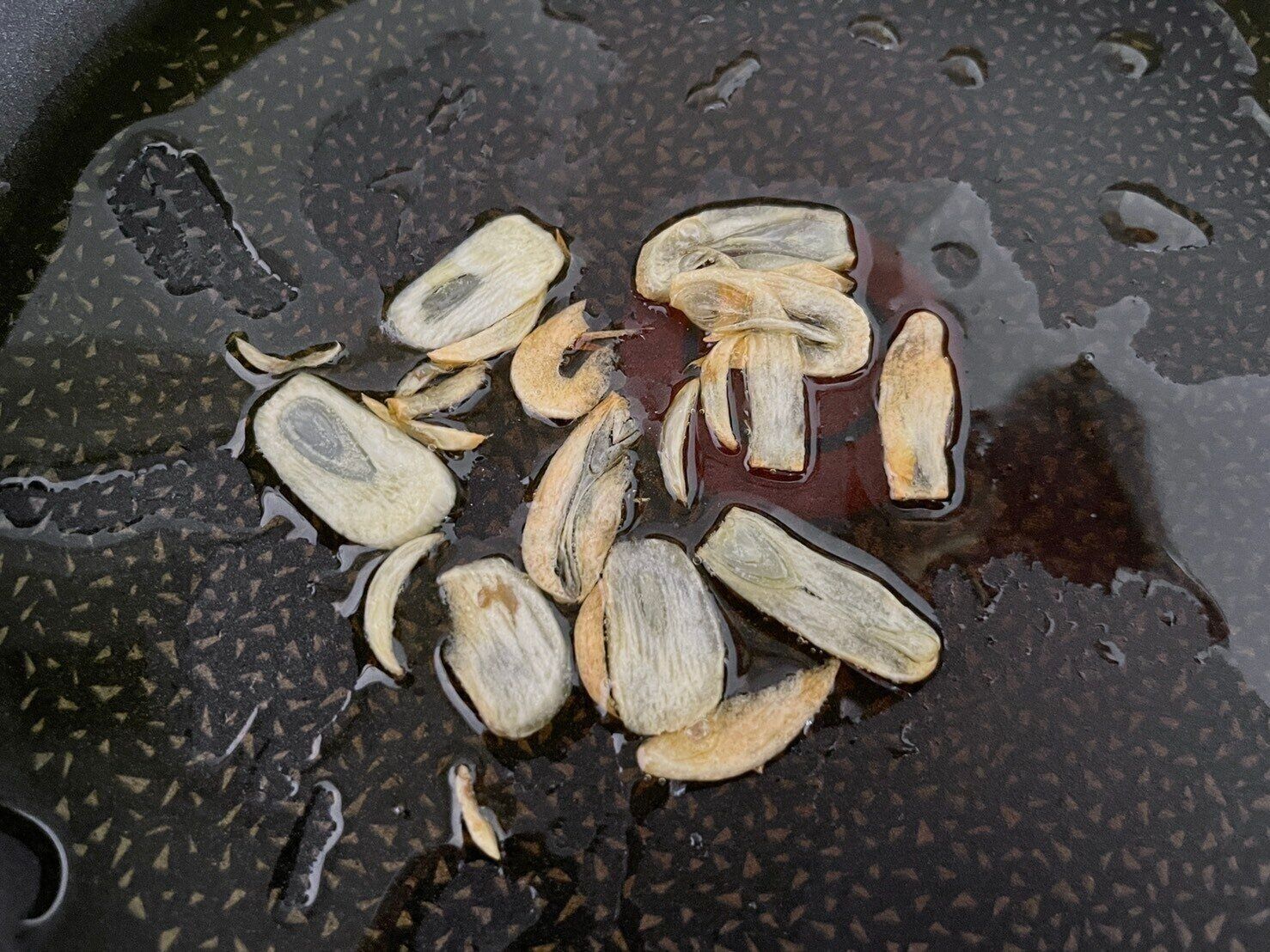 (2)フライパンにオリーブオイルと薄切りにしたにんにくを加えて香りが出るまで加熱する。