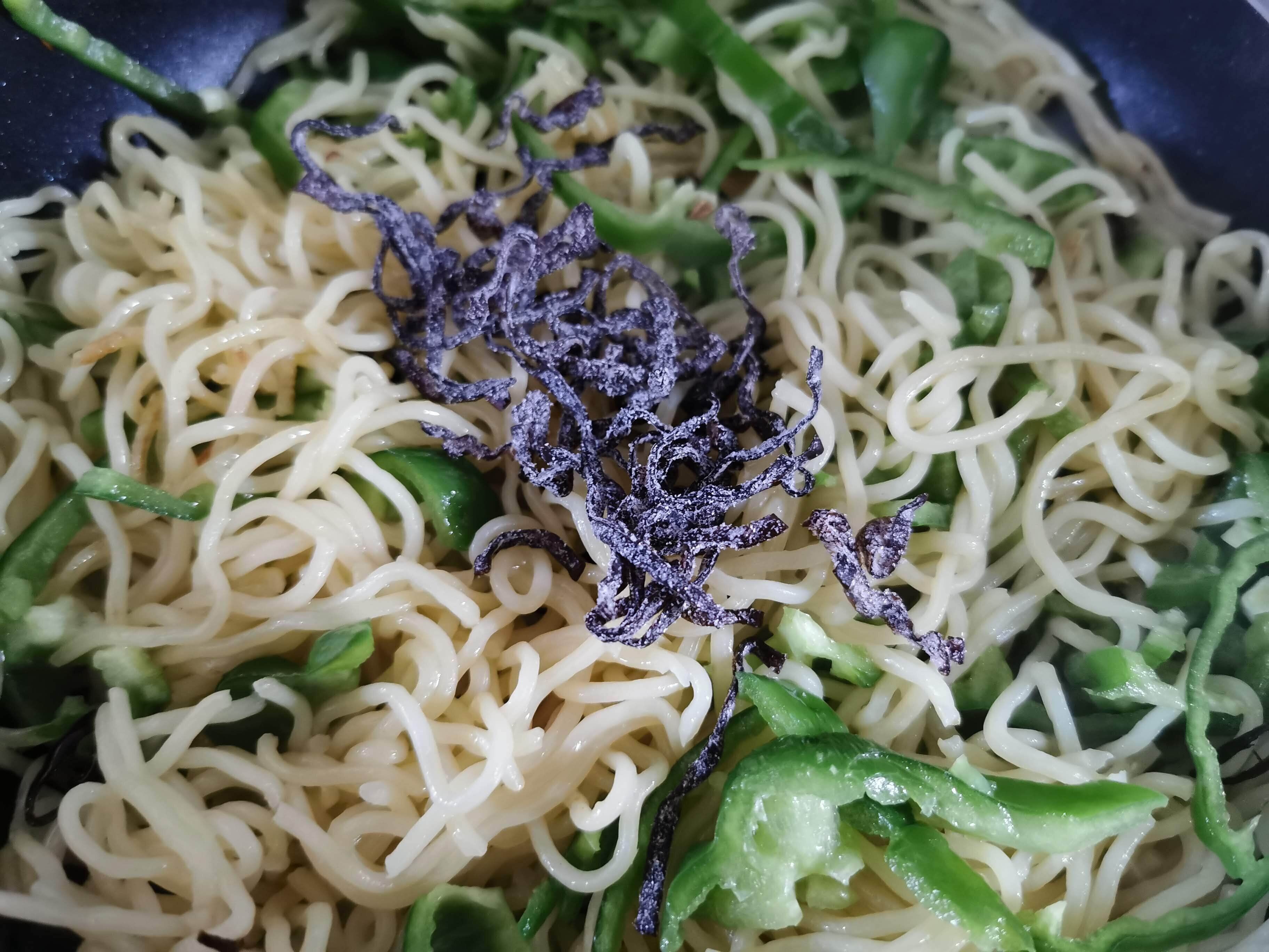 (3)火を強めてピーマンを加え、全体を炒めあわせたら塩昆布を加えて完成。