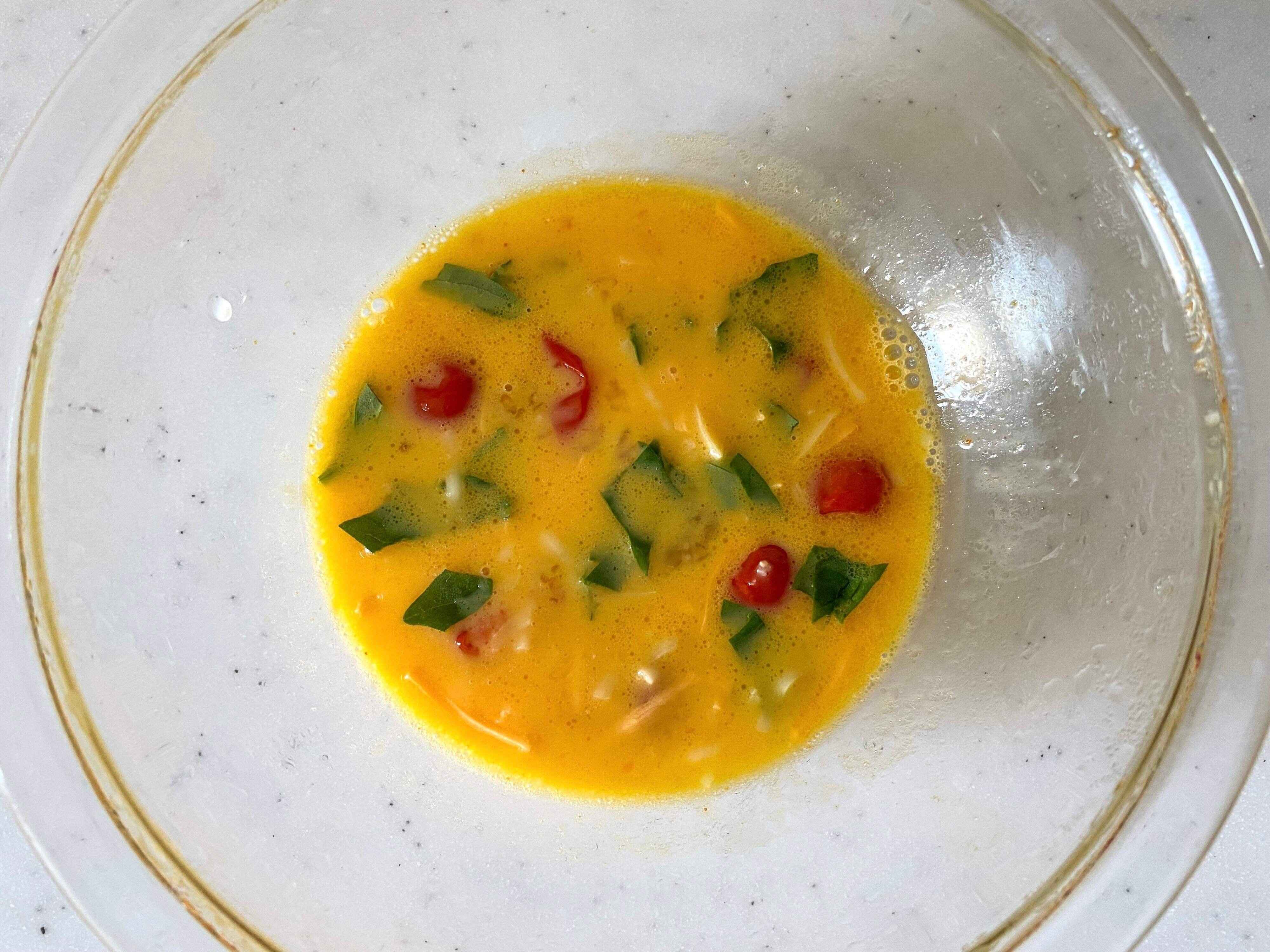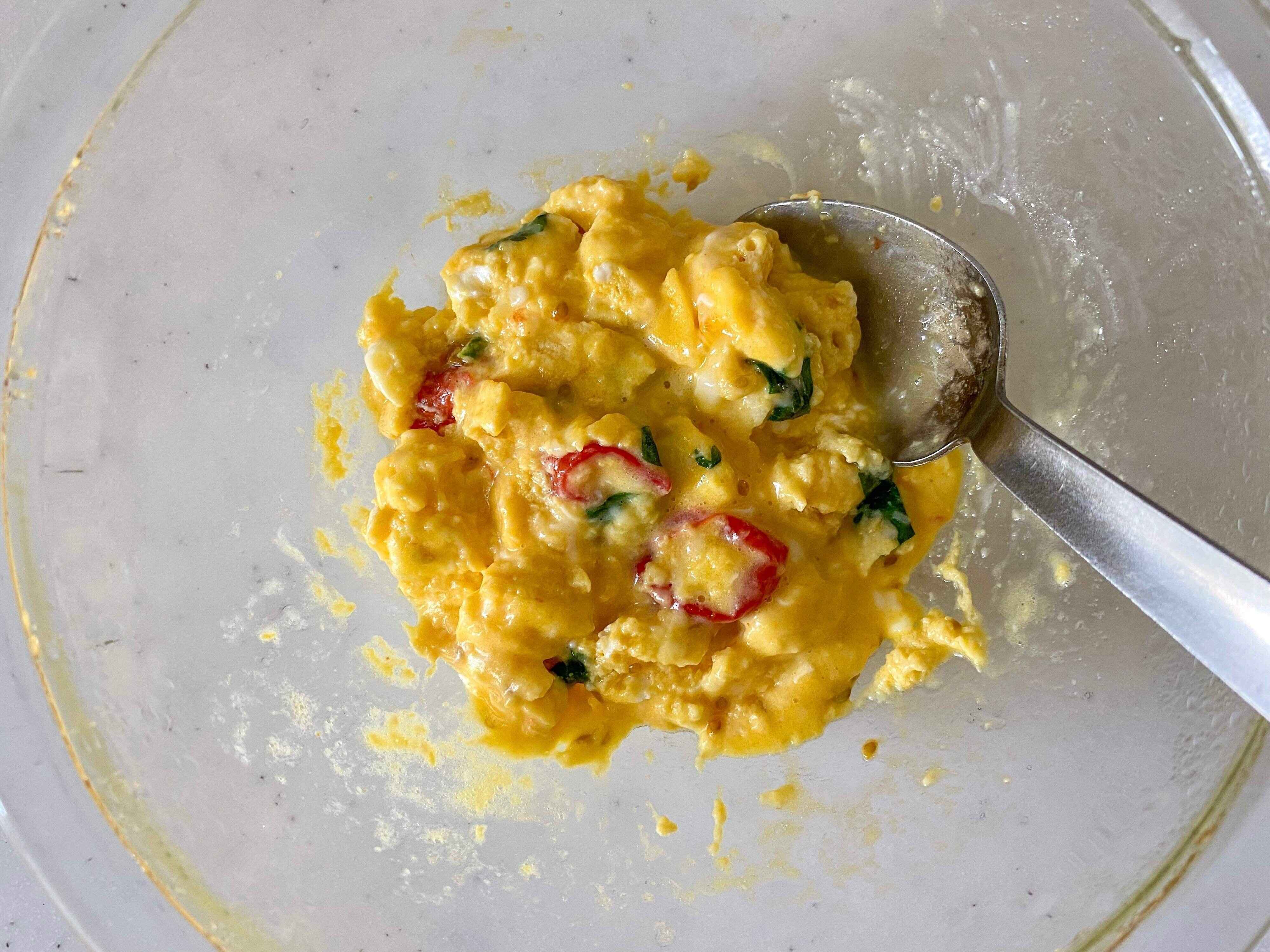 (2) 一度レンジから取り出し、卵、牛乳、残りの塩を加え、卵を溶きほぐす。ちぎったバジルの葉とシュレッドチーズを加えてさっと混ぜ、ふんわりラップをかけて1分電子レンジにかける。