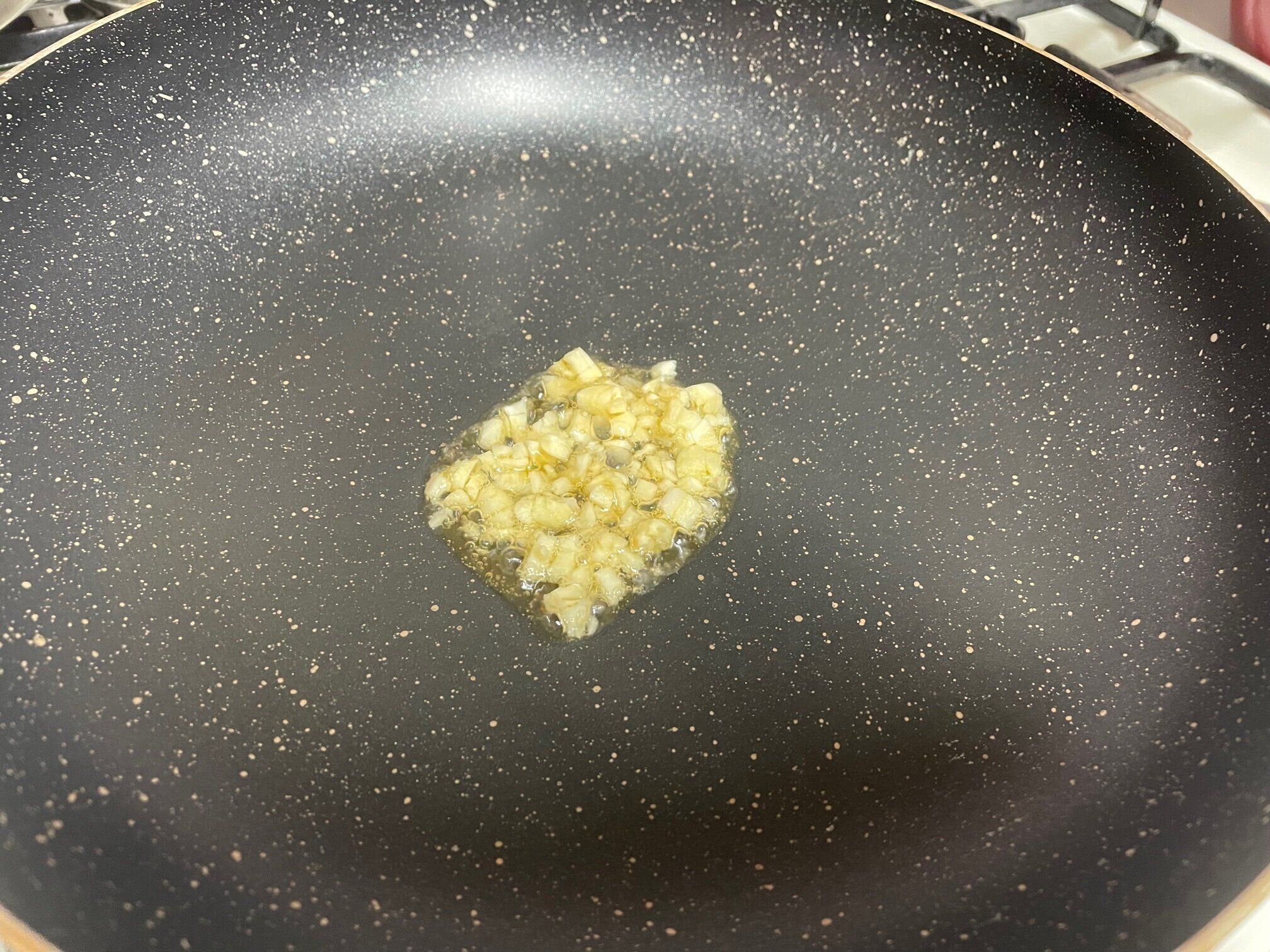 フライパンに油とニンニクを入れてから中火にかける。ニンニクを揚げ焼きするようにじっくりと、しかし焦げないように気をつけながらいい香りがするまで火をとおす。