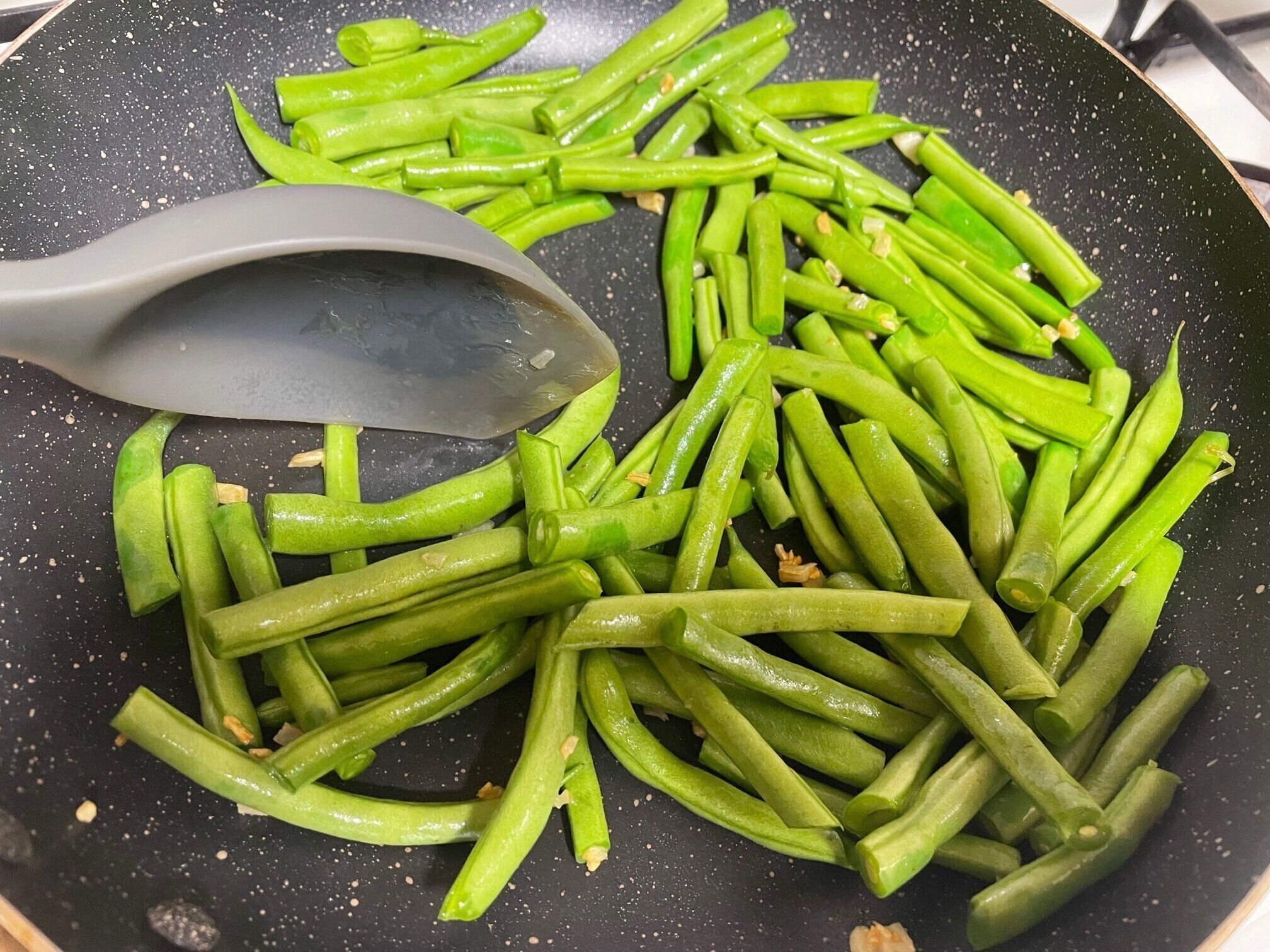 ニンニクに火がとおったら、いんげんを入れて炒める。火が強いとニンニクといんげんが焦げるので、そのままの火加減で。いんげんの色が鮮やかな緑に変わり火がとおるまで炒める。