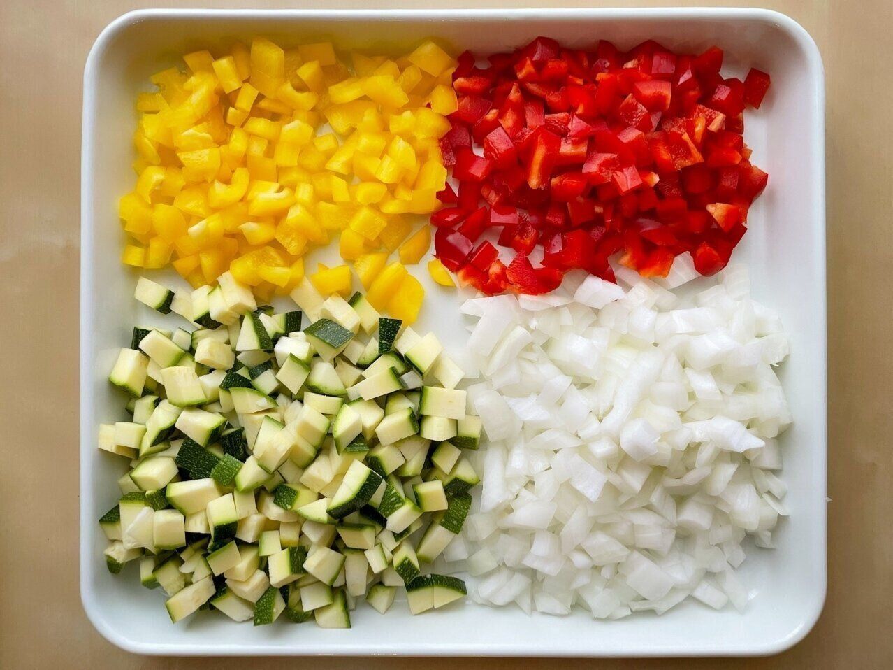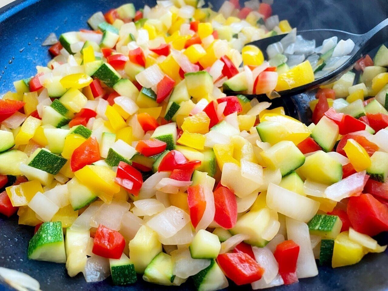 ズッキーニ、赤・黄パプリカ、たまねぎをダイスカットにして炒めた野菜ミックスがあれば、毎回野菜の下ごしらえをする手間もなく、手軽に野菜と彩りを料理にプラスすることができます。
