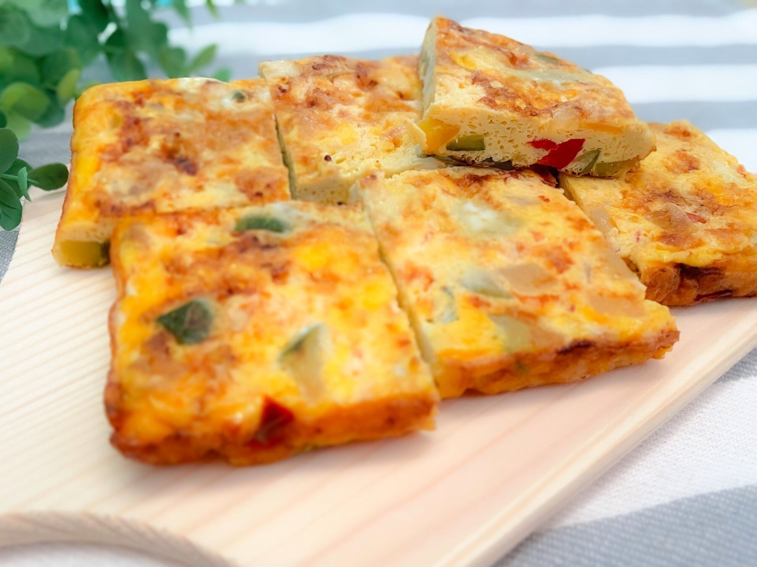 溶き卵に凍ったままの彩り野菜ミックスを加えたら、いつもと同じように焼くだけ。たまご焼き器で焼くと、お弁当にもぴったりです。