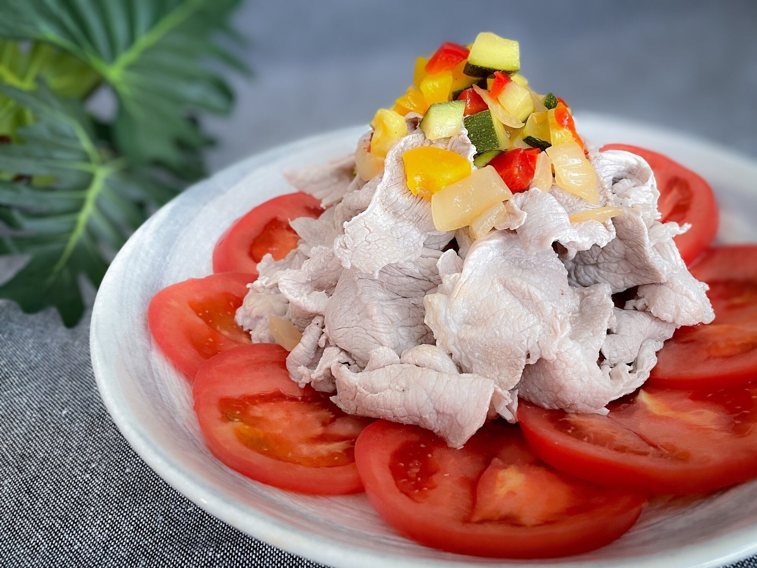 暑くなると食べる機会が増える豚しゃぶにも、彩り野菜ミックスをのせるだけで野菜と彩りをプラス。サラダ仕立ての冷製メニューなので、野菜ミックスは凍ったままのせて、半解凍くらいで食べるとシャリシャリと冷たくて、さっぱり食べられます。