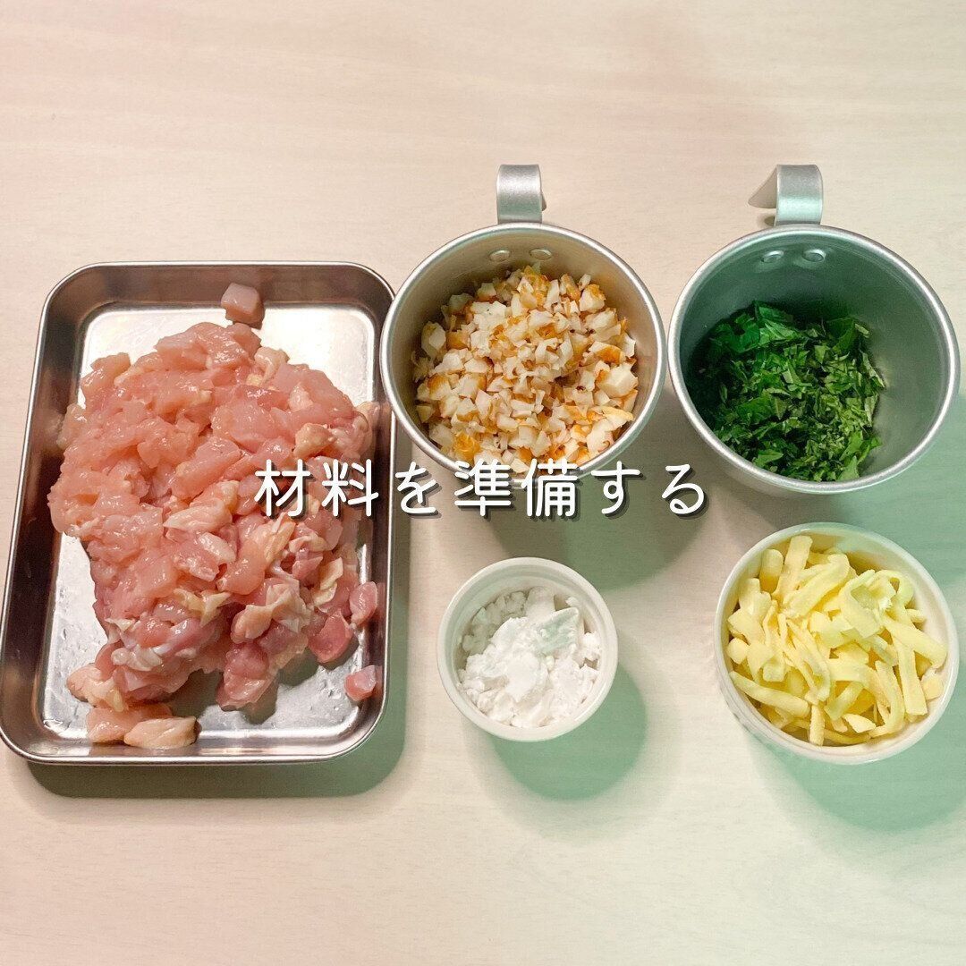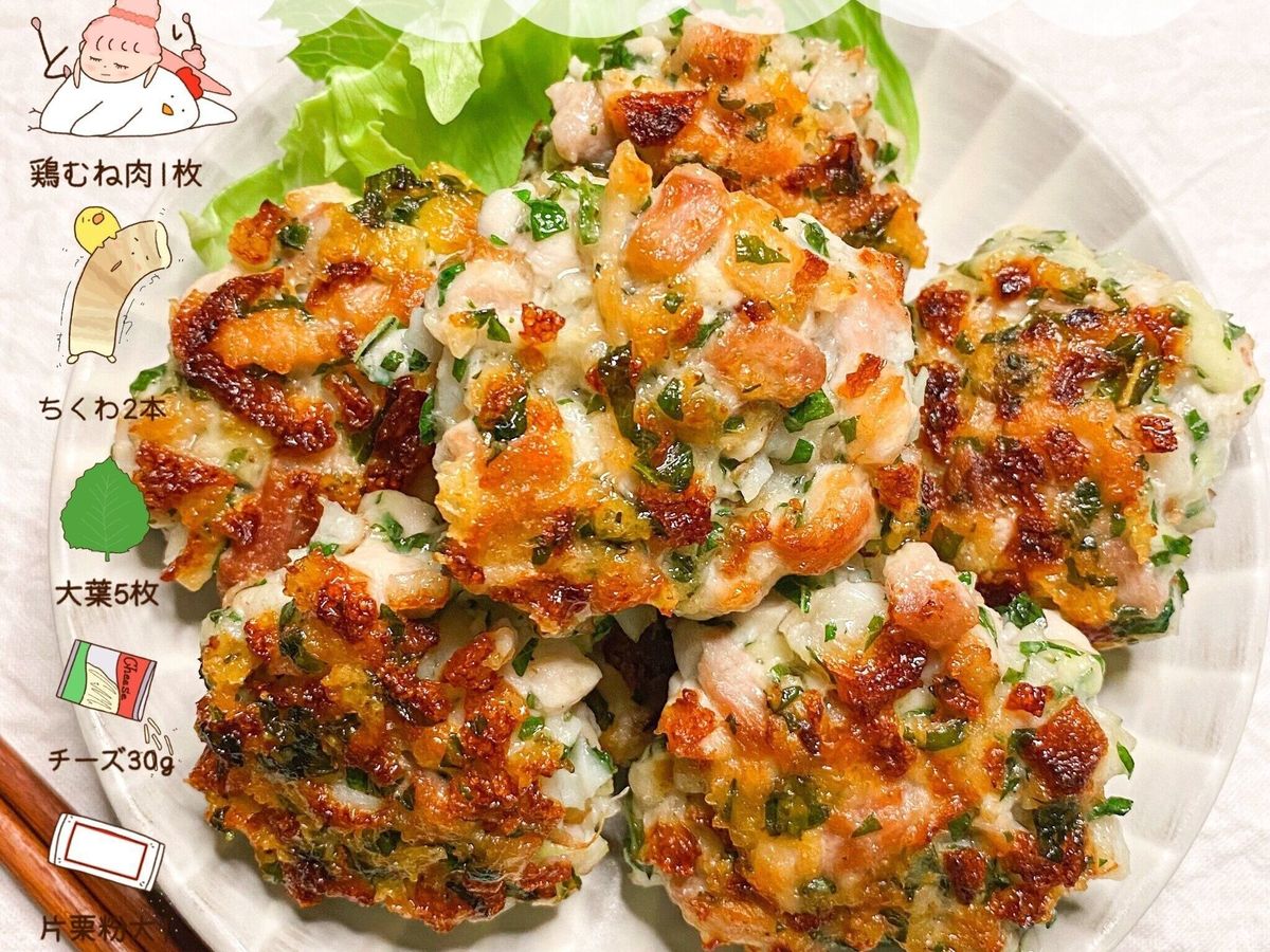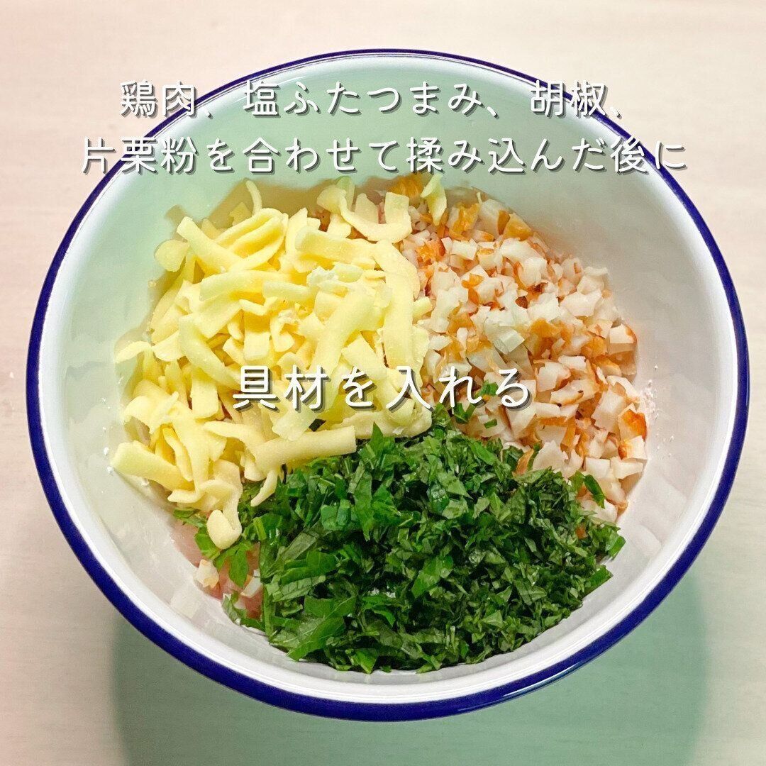 2-3cm角に切った鶏肉、塩ふたつまみ、胡椒、片栗粉を合わせても見込んだ後、刻んだちくわと大葉、チーズをいれます。