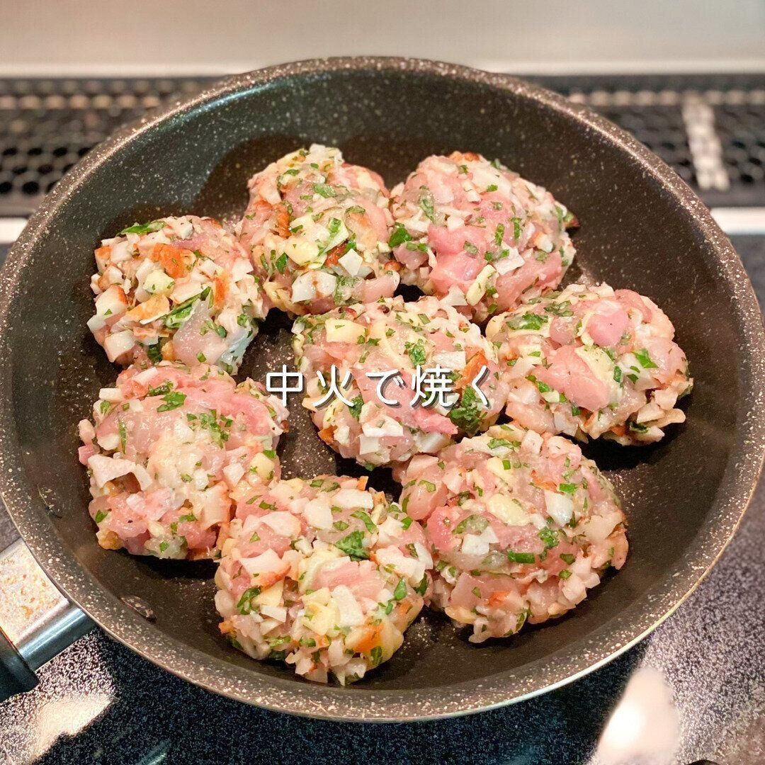 手のひらサイズくらいに成形し、中火で焼きます。