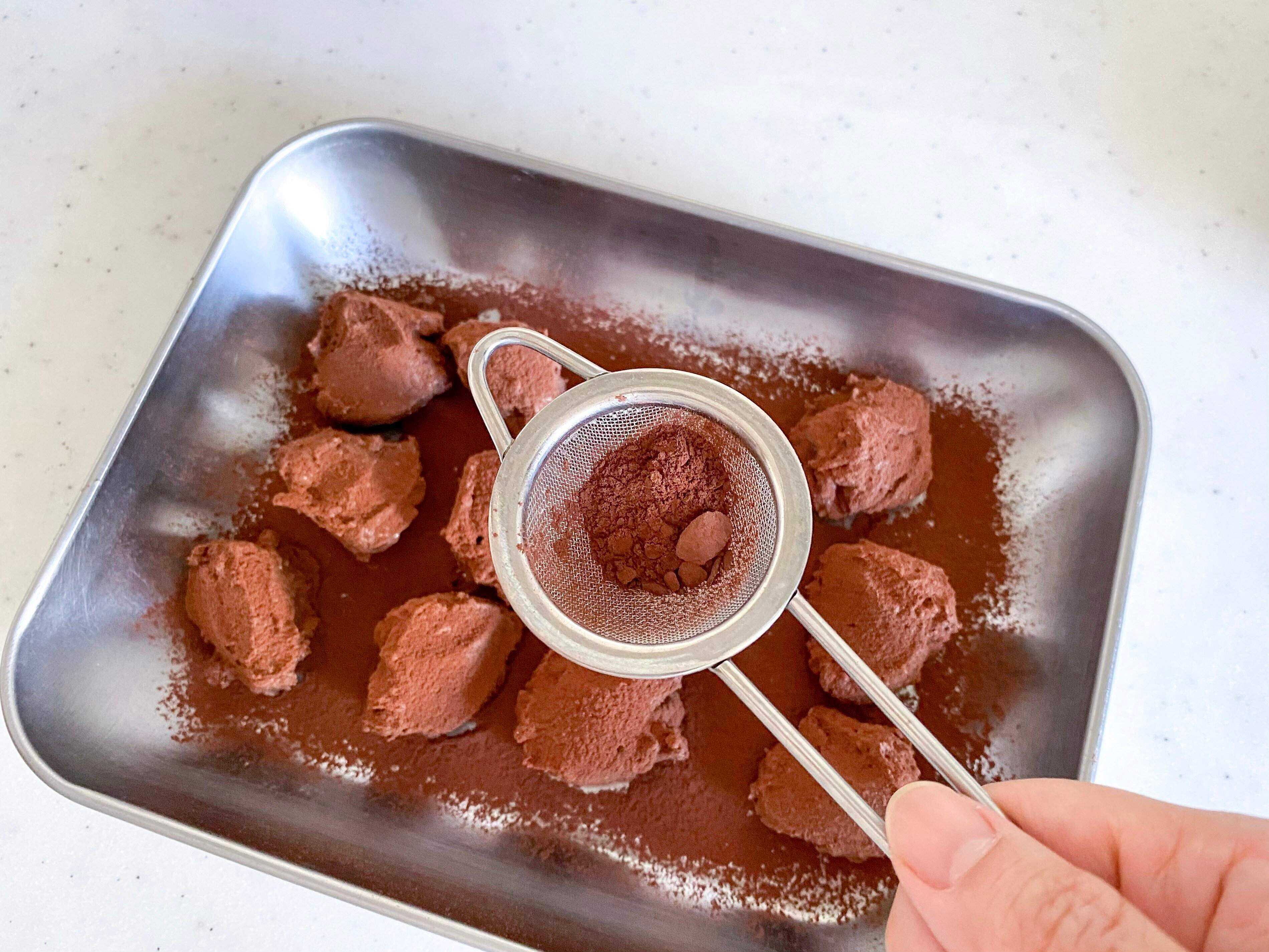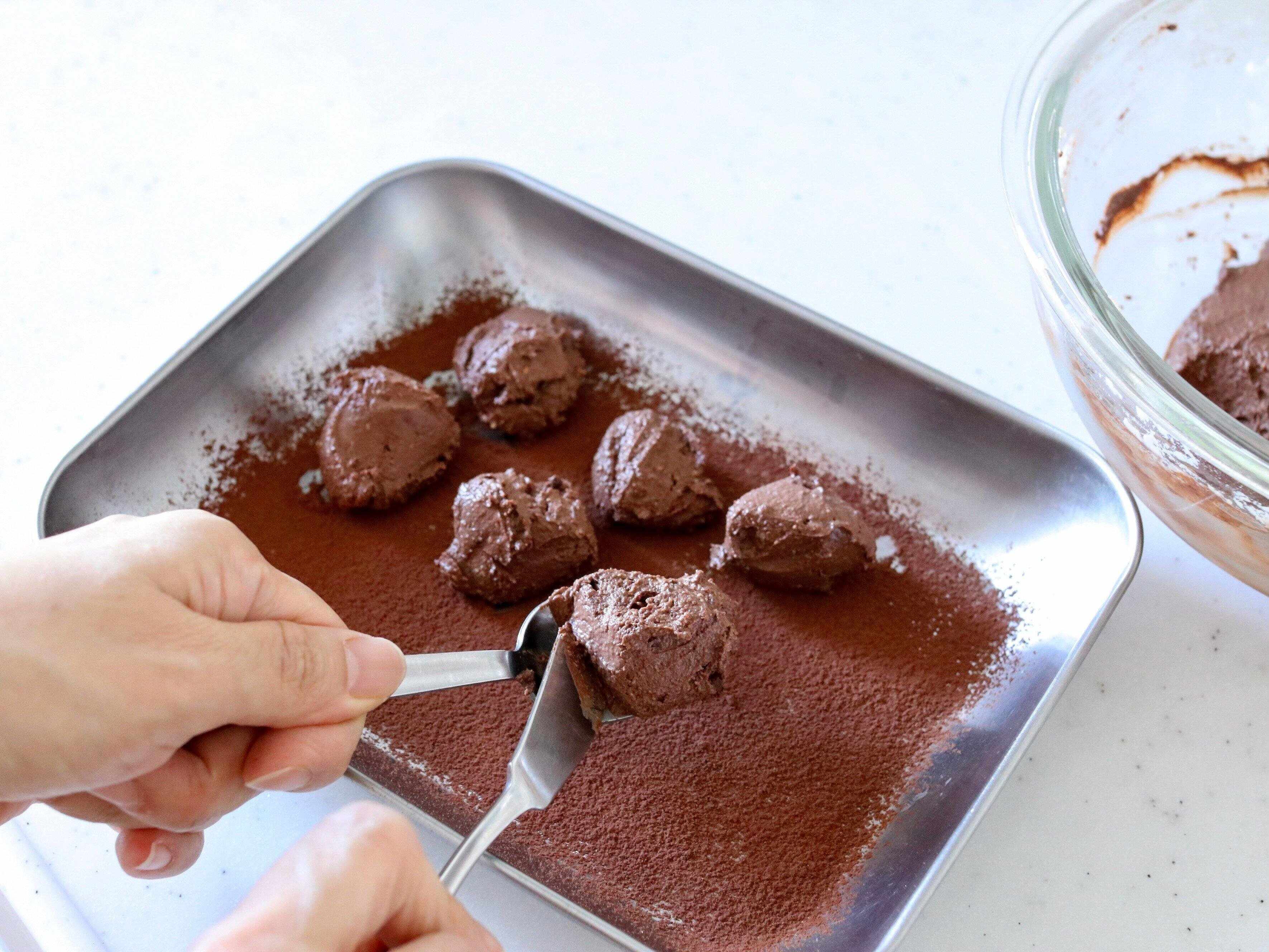(3) バットにココア(ここからのココアは分量外)をふる。冷蔵庫から取り出した2を、スプーンを使って食べやすい大きさに丸め、バットに並べていく。