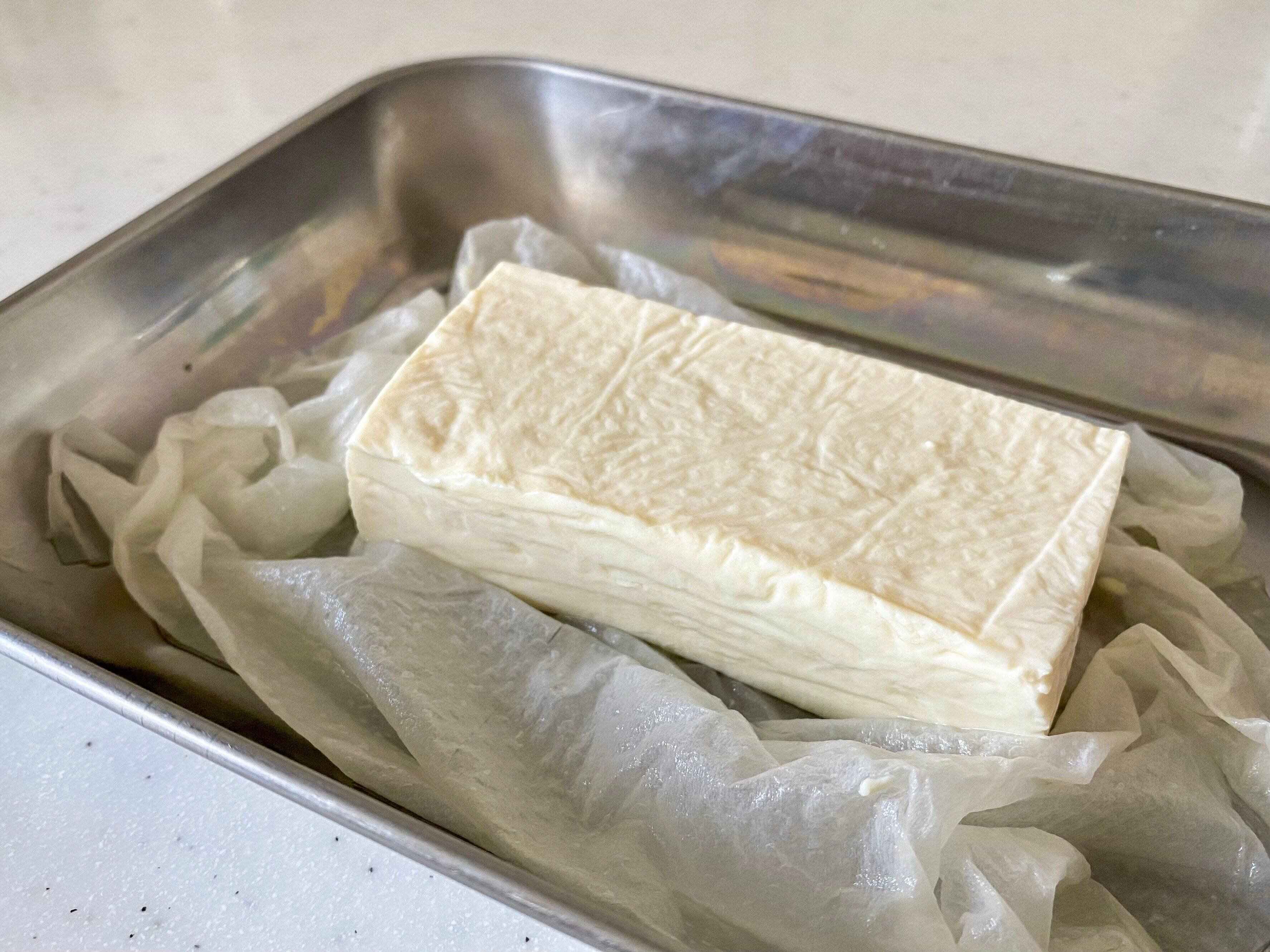 半日以上水切りした豆腐は、キッチンペーパーを取るとシワシワになり、水がかなり抜けています。