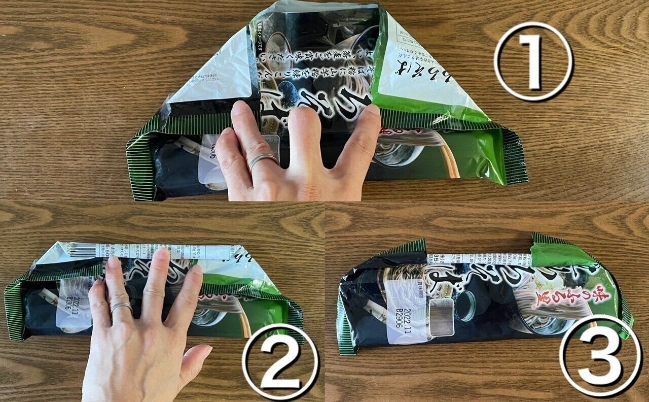 麺を立てた状態ではなく、横にした状態でガバっと袋を開けてみましょう。まず、麺がスッと取り出しやすくなります。