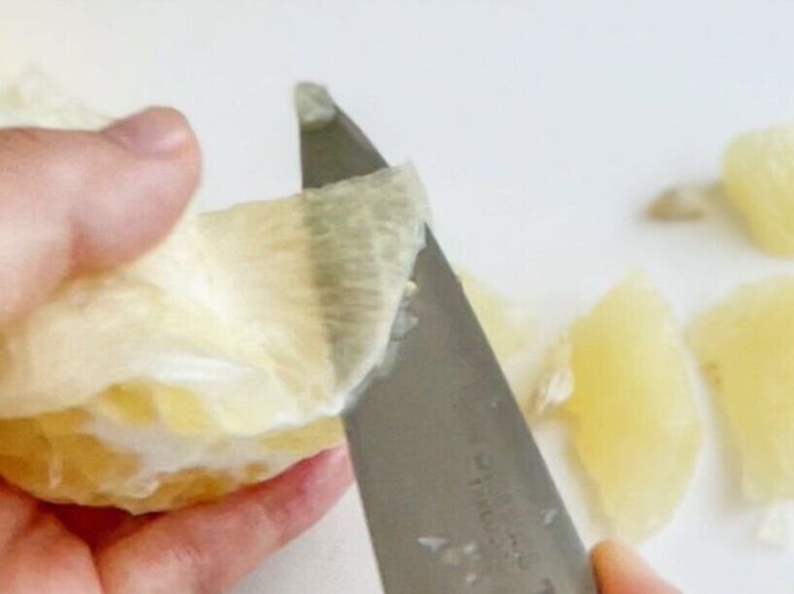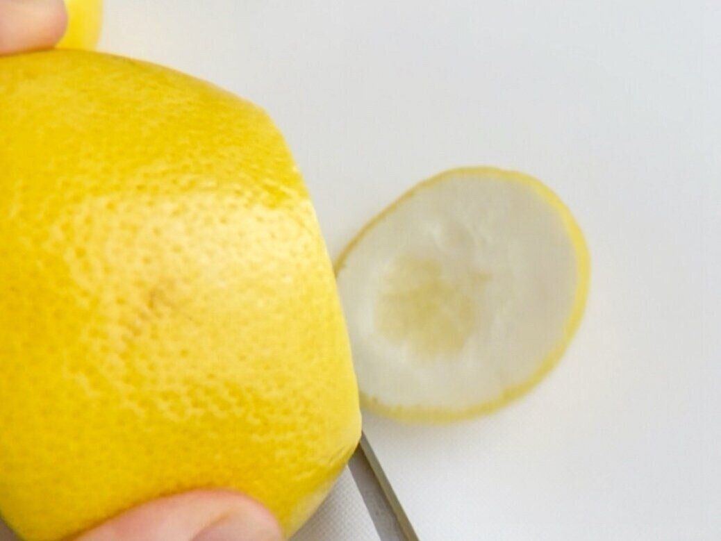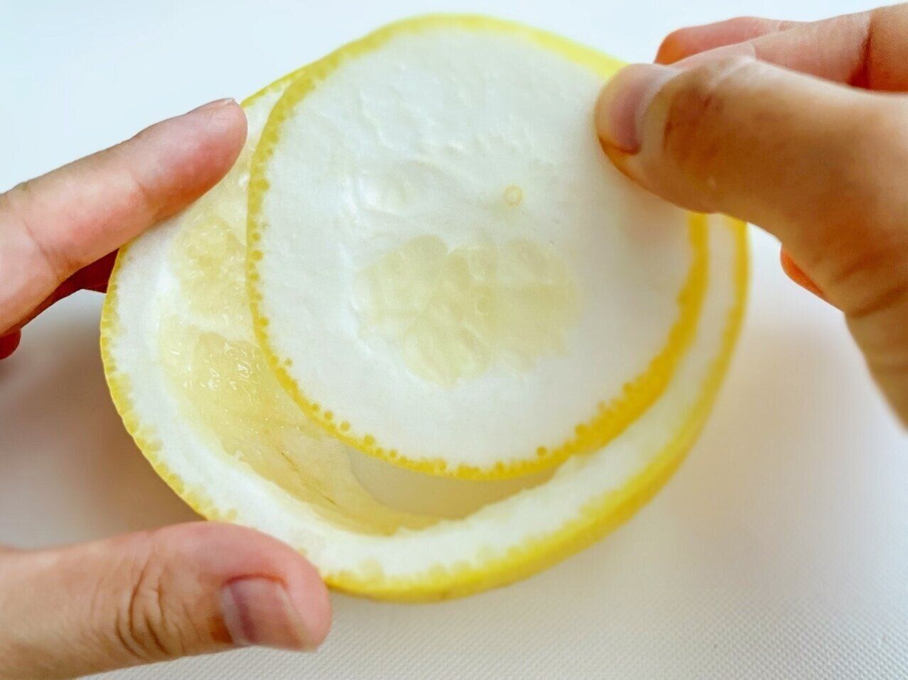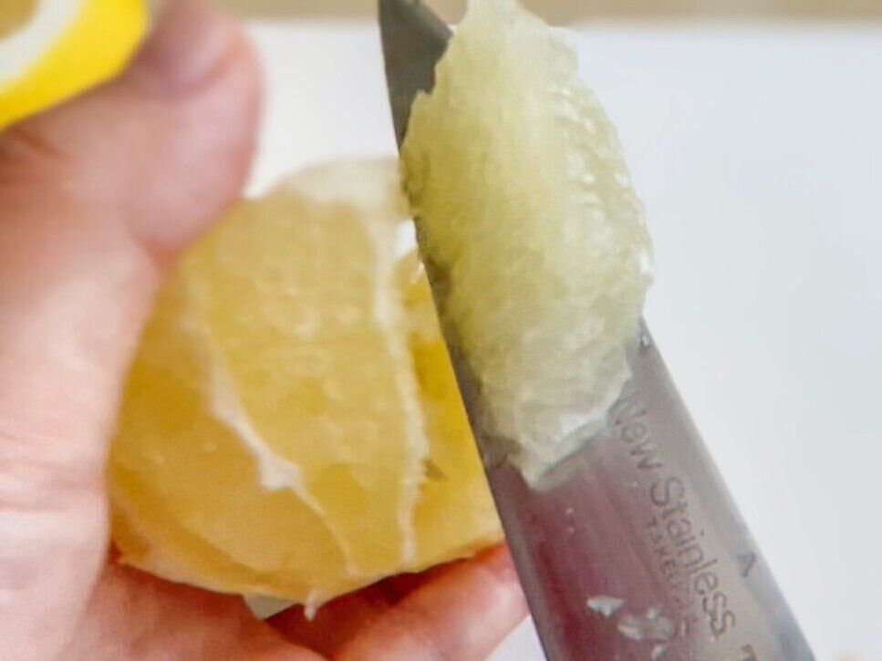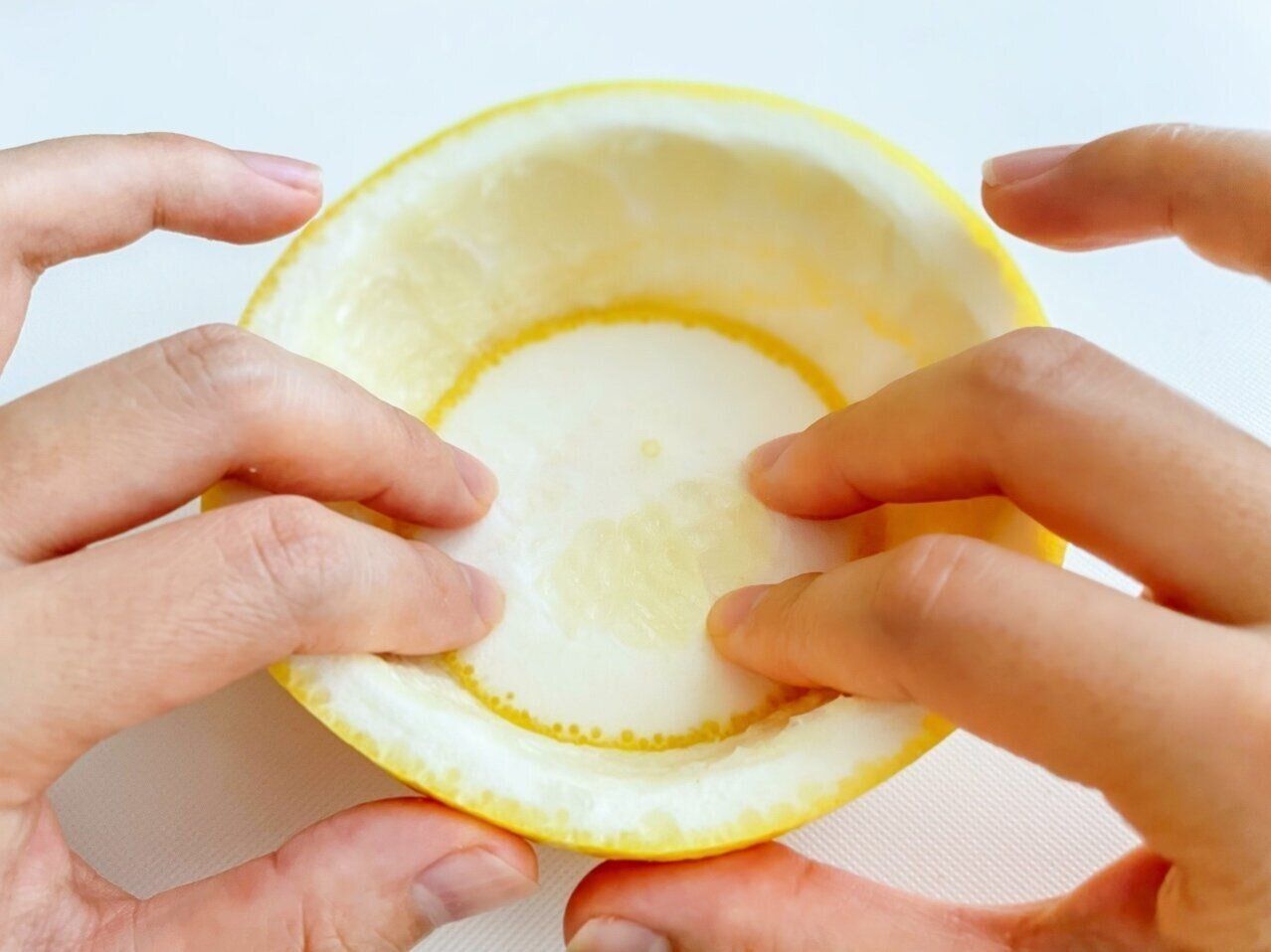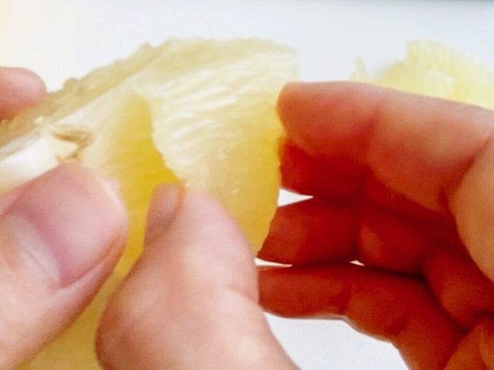 (4) 皮を落としたら、残った白いワタの部分もていねいに取り除く。