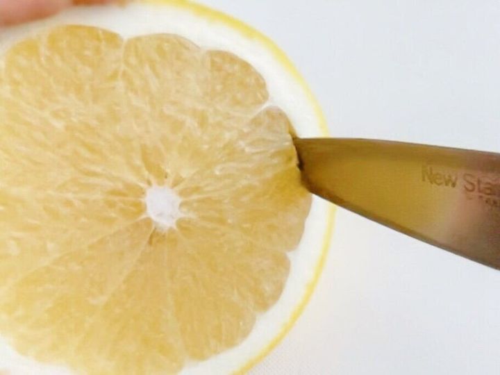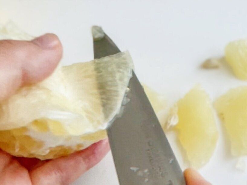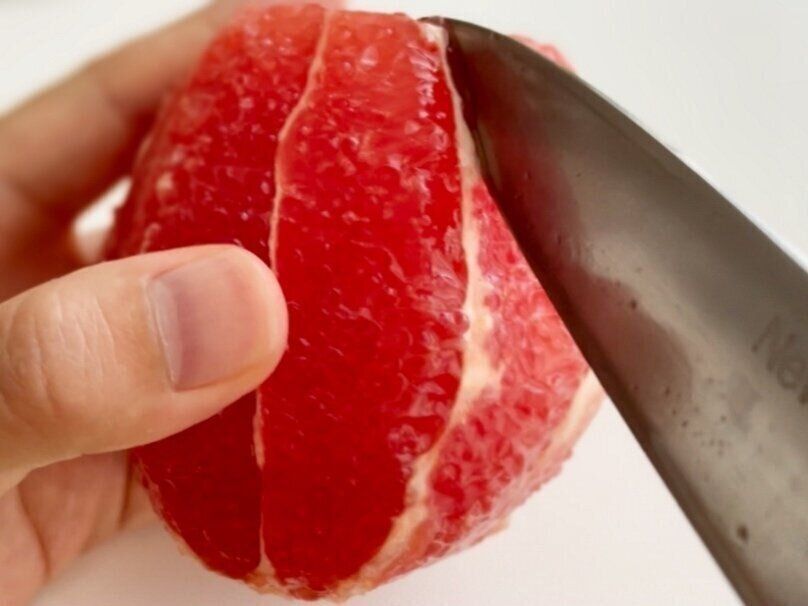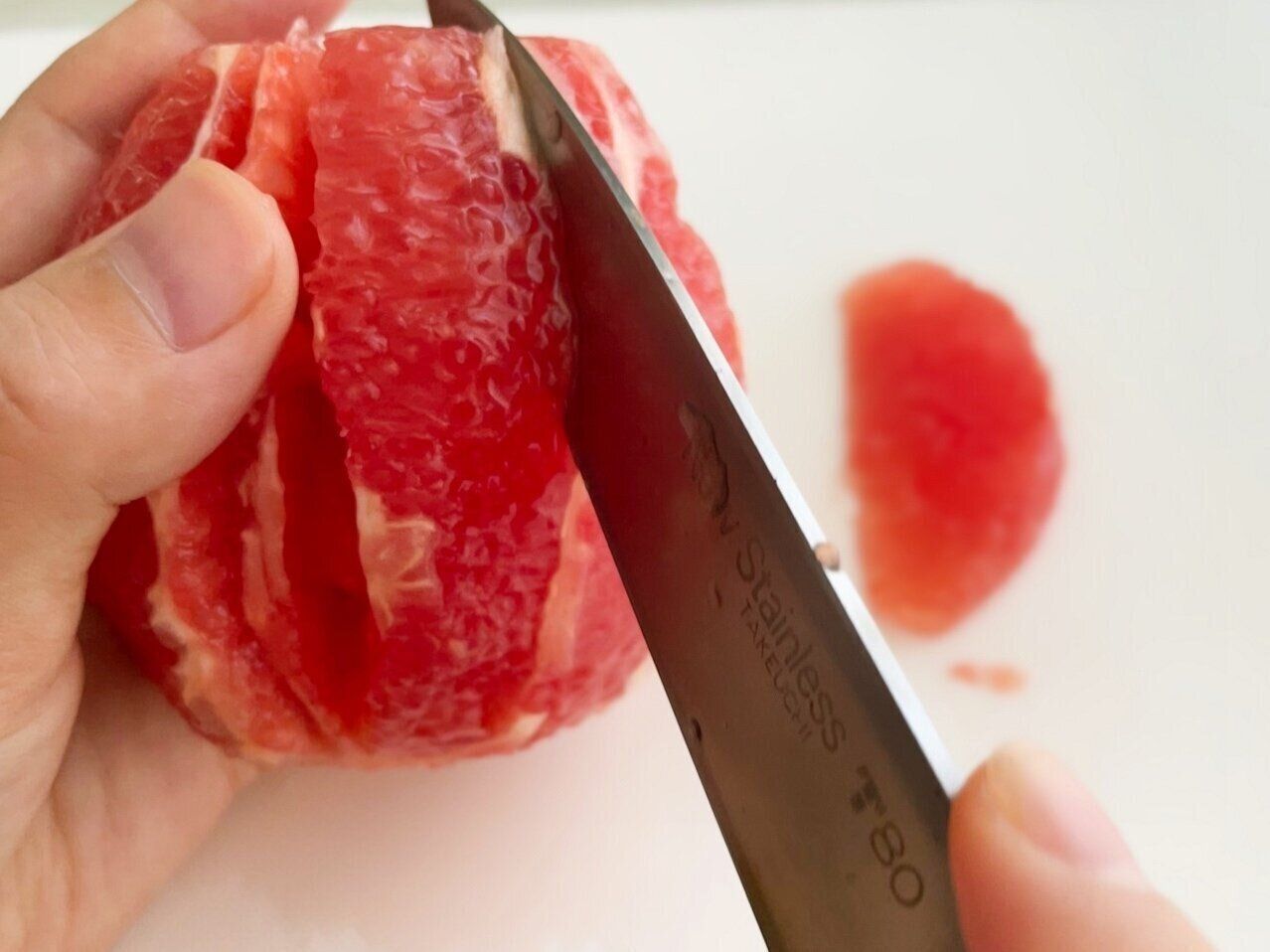 半分にカットしてあるグレープフルーツは、薄皮に沿って包丁を入れると