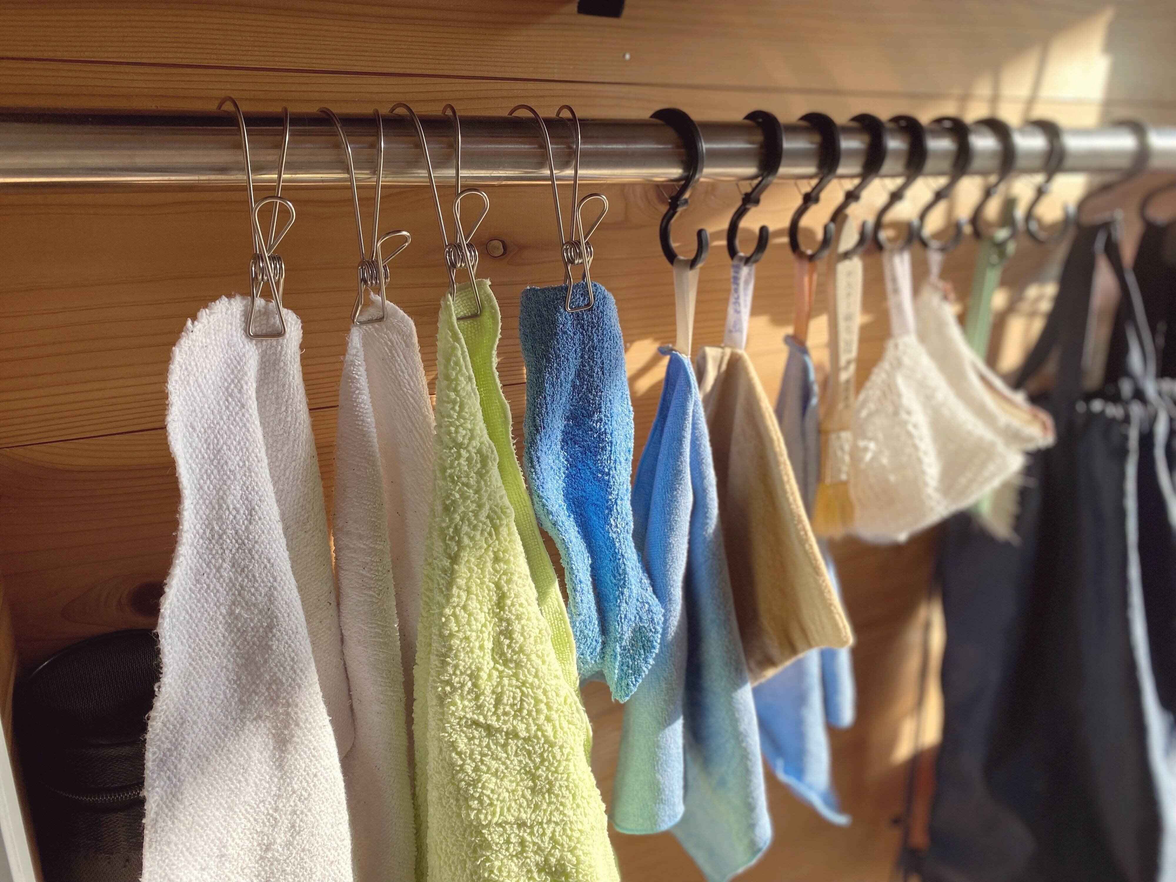 勝手口のような家族しか使わない場所にポールを取り付け、掃除グッズをまとめて吊り下げておく方法はおすすめです。
