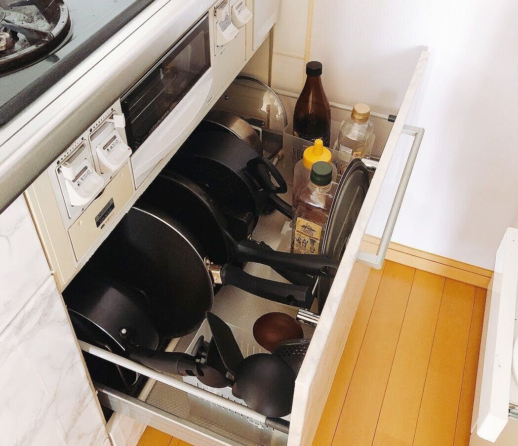 調理中のラクさを優先するなら、お玉やフライ返し、フライパンなどをかけて収納したり、調味料を出しておいたりするのも1つの方法。でも、私はそこに油が飛んで掃除の手間がかかる方が嫌なのです。