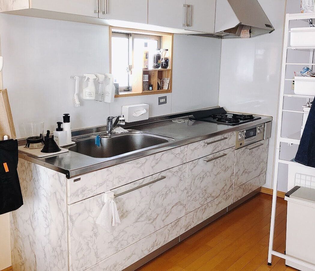 キッチンの壁紙も汚れが落としにくいものだったので、上からシートを貼って拭くだけで済むようにしています。