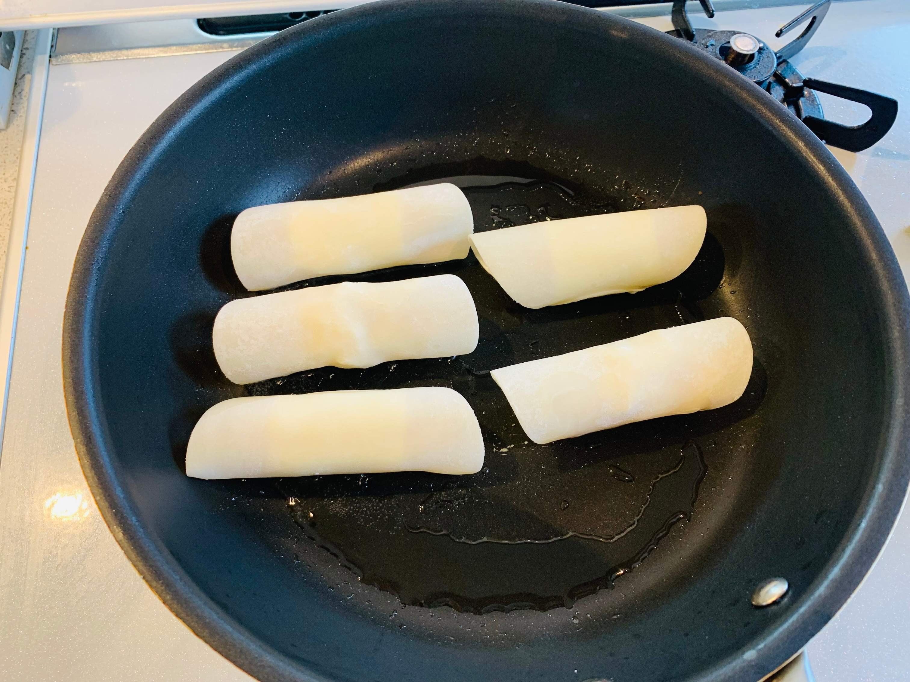 フライパンに多めの油(分量外、大さじ2くらい)を敷き、綴じ目を下にして焼きます。